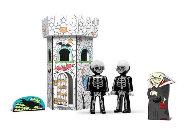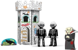 - Torre del castello pieghevole in cartone con motivi prestampati, 2 personaggi IGRÁČEK (Kostřík e Kostřička), figurina di vampiro in cartone, testo della fiaba in CZ e SK