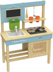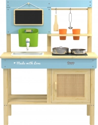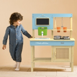 Questa cucina per bambini di alta qualità è realizzata in legno naturale certificato e progettata senza spigoli vivi per un gioco sicuro dai 3 anni. Grazie alla struttura resistente e alla disposizione intelligente con ganci e mensole, i piccoli ripongono facilmente stoviglie e utensili. La piccola lavagna funge da menu o lista di compiti: bastano gessetto e fantasia per dare il via al divertimento.