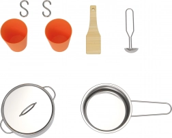 Contenuto della confezione: pentolini con coperchi, 2 bicchieri, spatola, cucchiaio, ganci a sospensione, lavagna per gessetti e dotazioni base della cucina (lavello, piastre, mensole). Scelta perfetta per angoli gioco all’aperto e al coperto per piccoli chef.