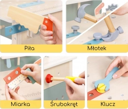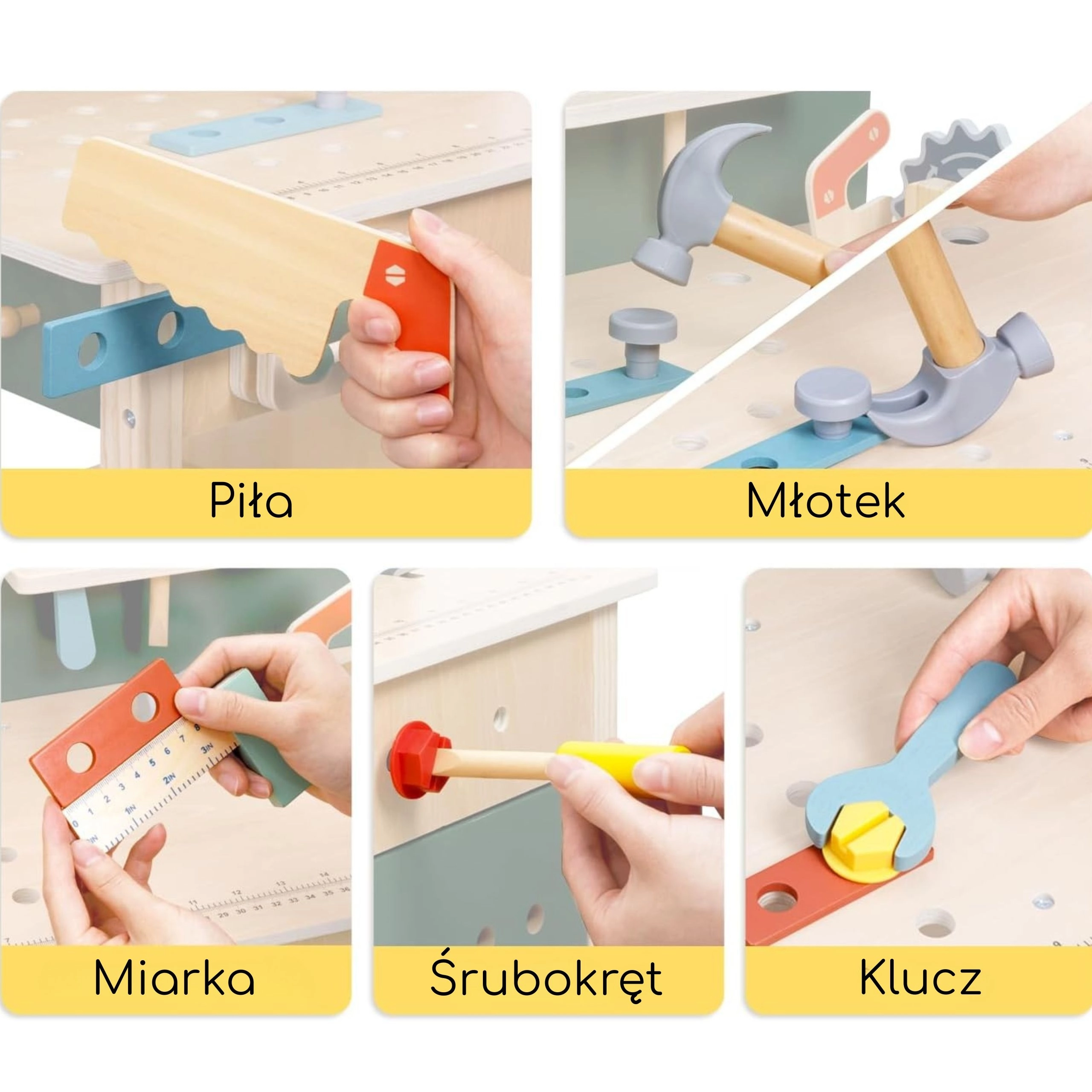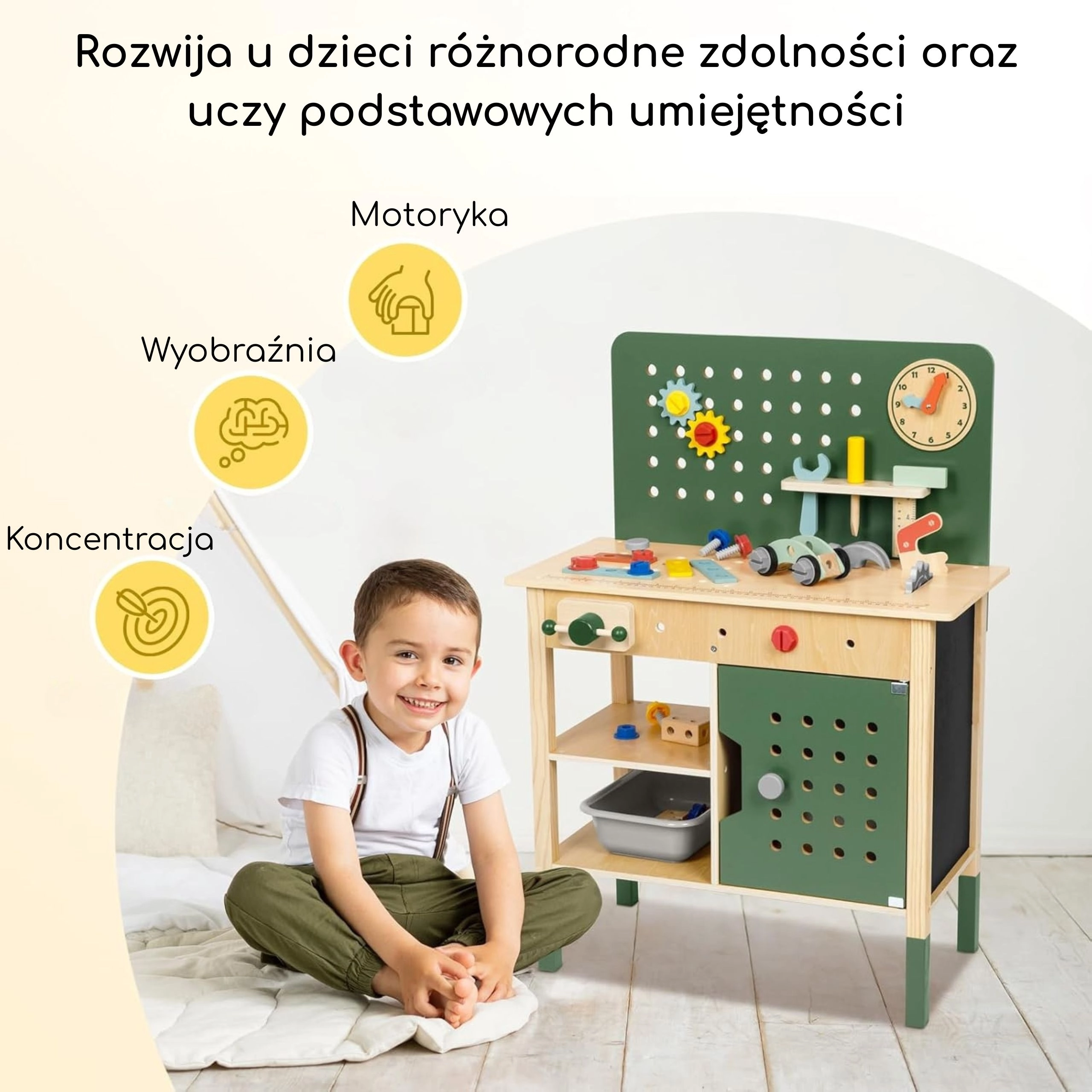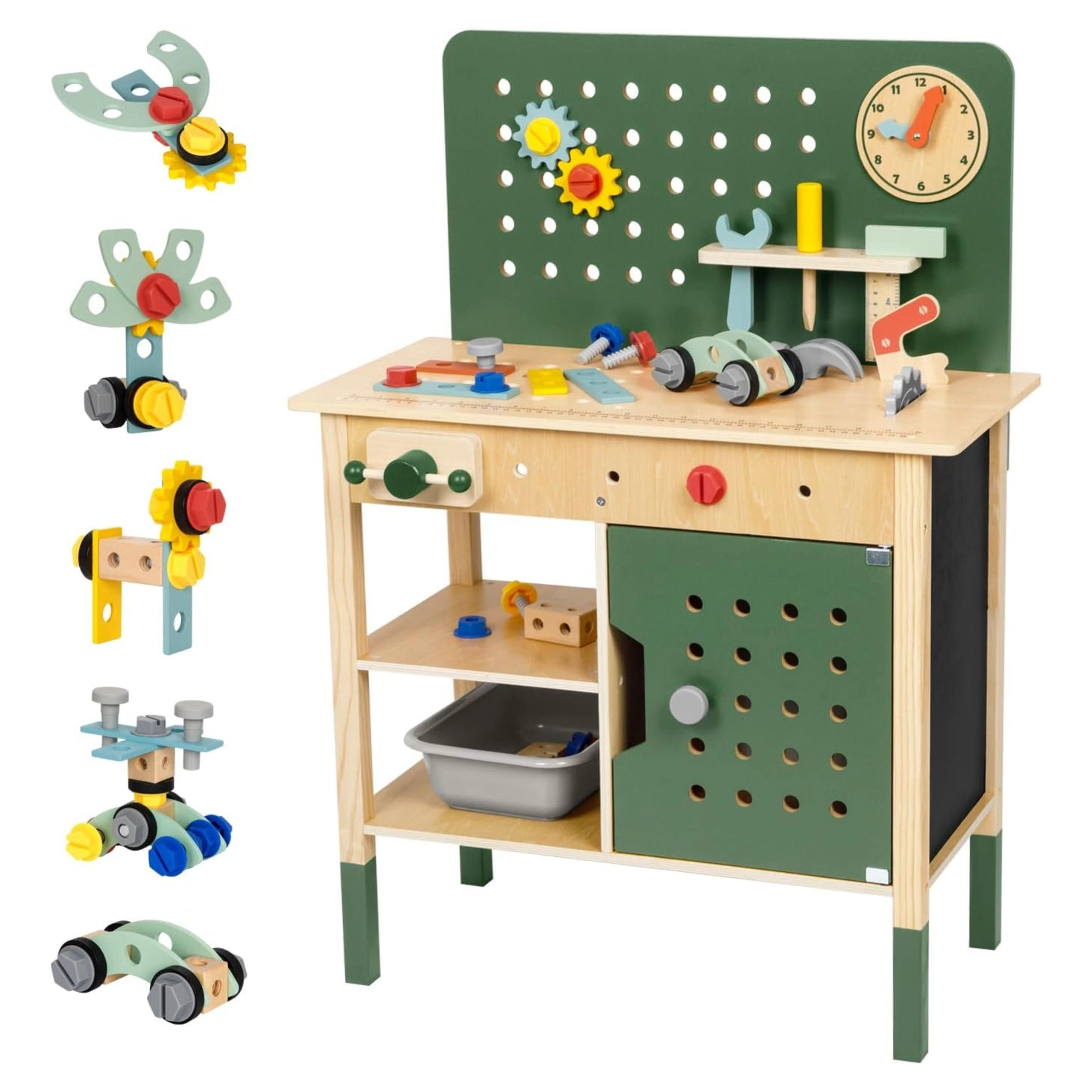 Questa officina in legno è pensata per i piccoli ingegneri che vogliono esplorare i principi degli strumenti, costruire i loro primi modelli e sviluppare il pensiero logico. Grazie ai bordi accuratamente levigati, alla struttura resistente e allo spazio di archiviazione ben studiato, il gioco è non solo divertente, ma anche organizzato e sicuro.
