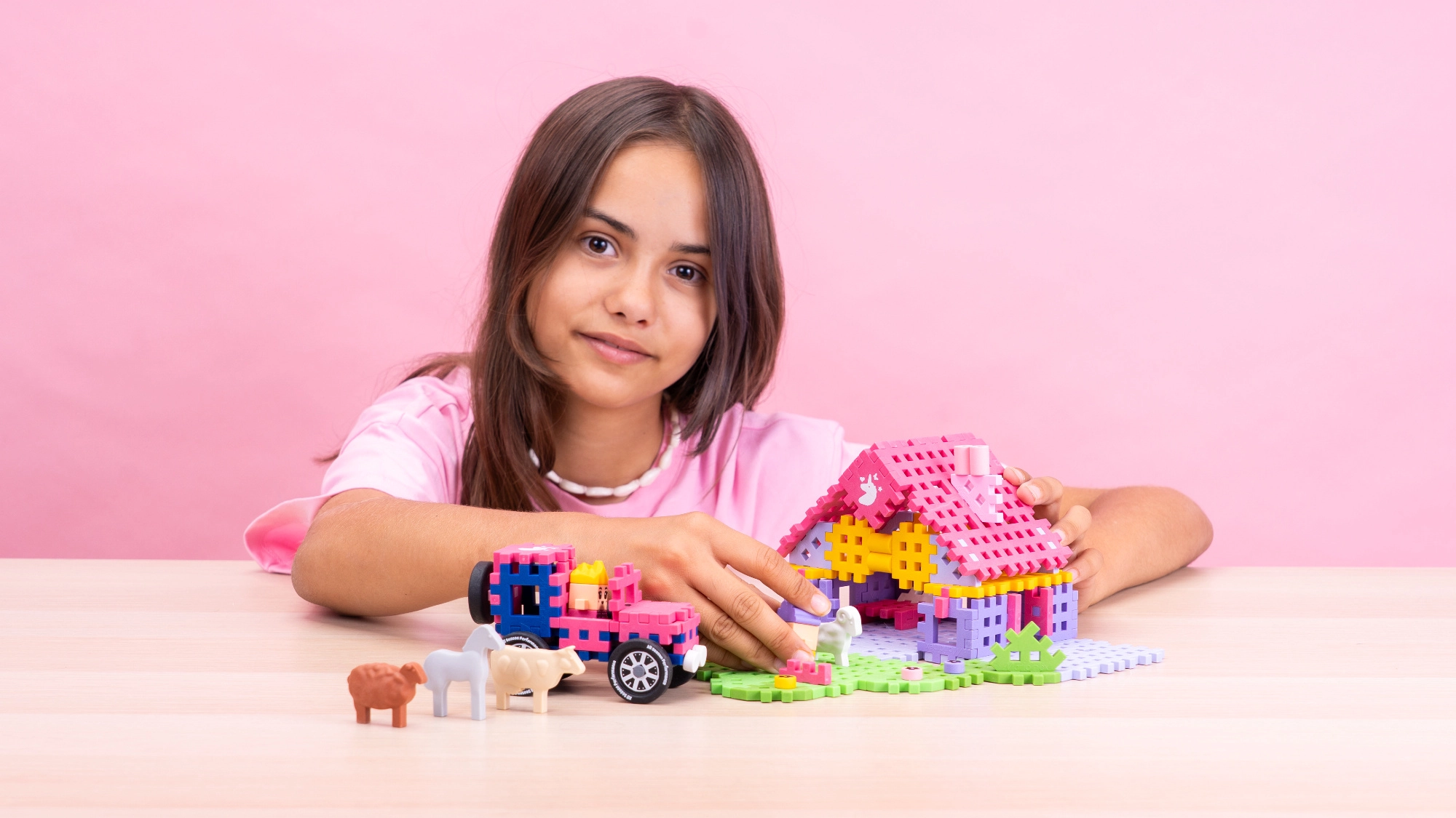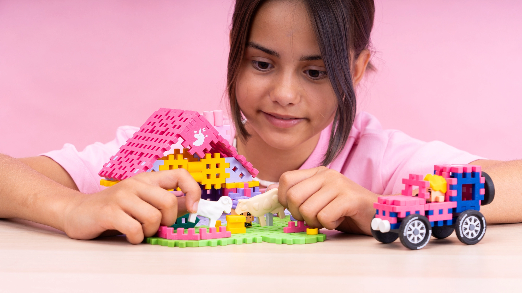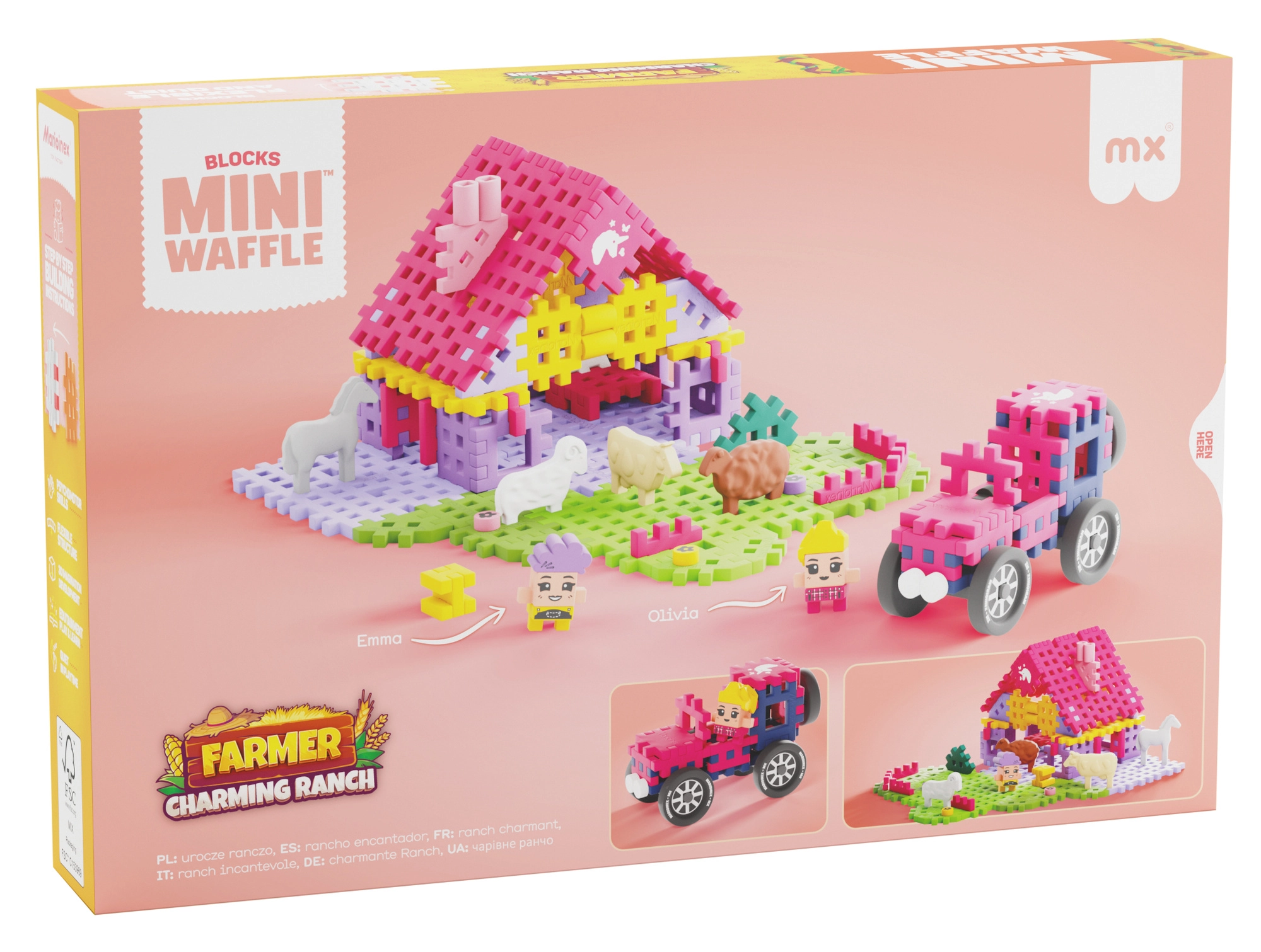 Casetta, recinti, animaletti e dettagli del paesaggio – tutto con i colorati pezzi Mini Waffle che incoraggiano il gioco creativo e lo sviluppo della fantasia.