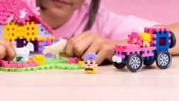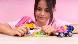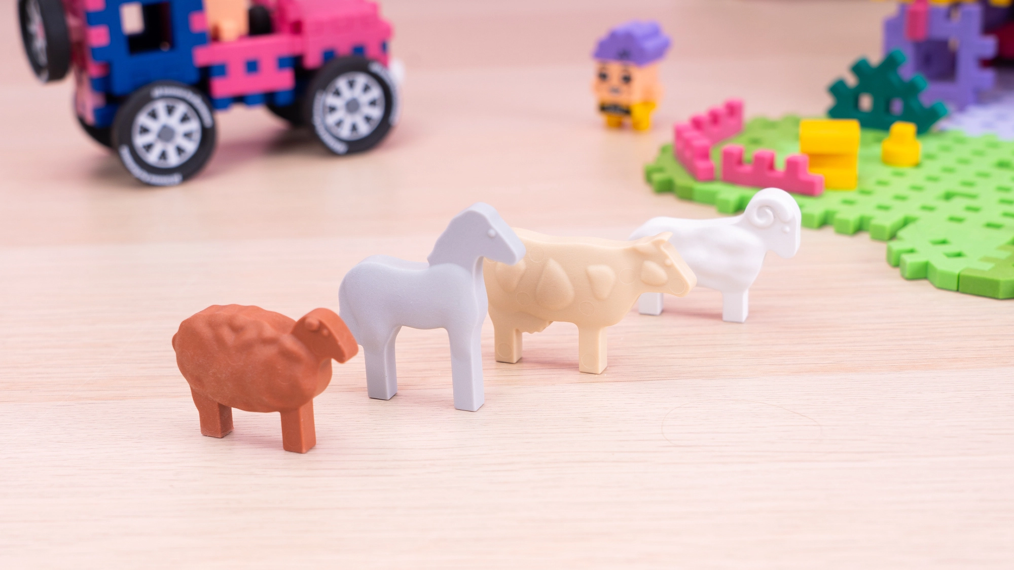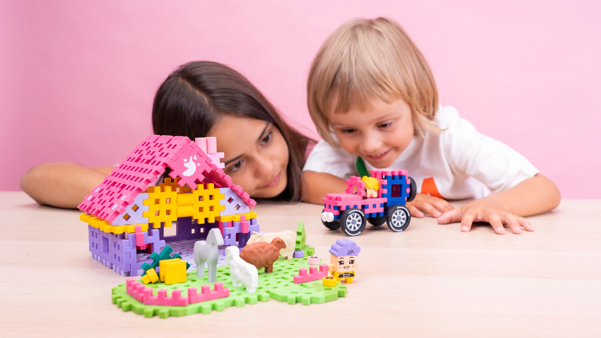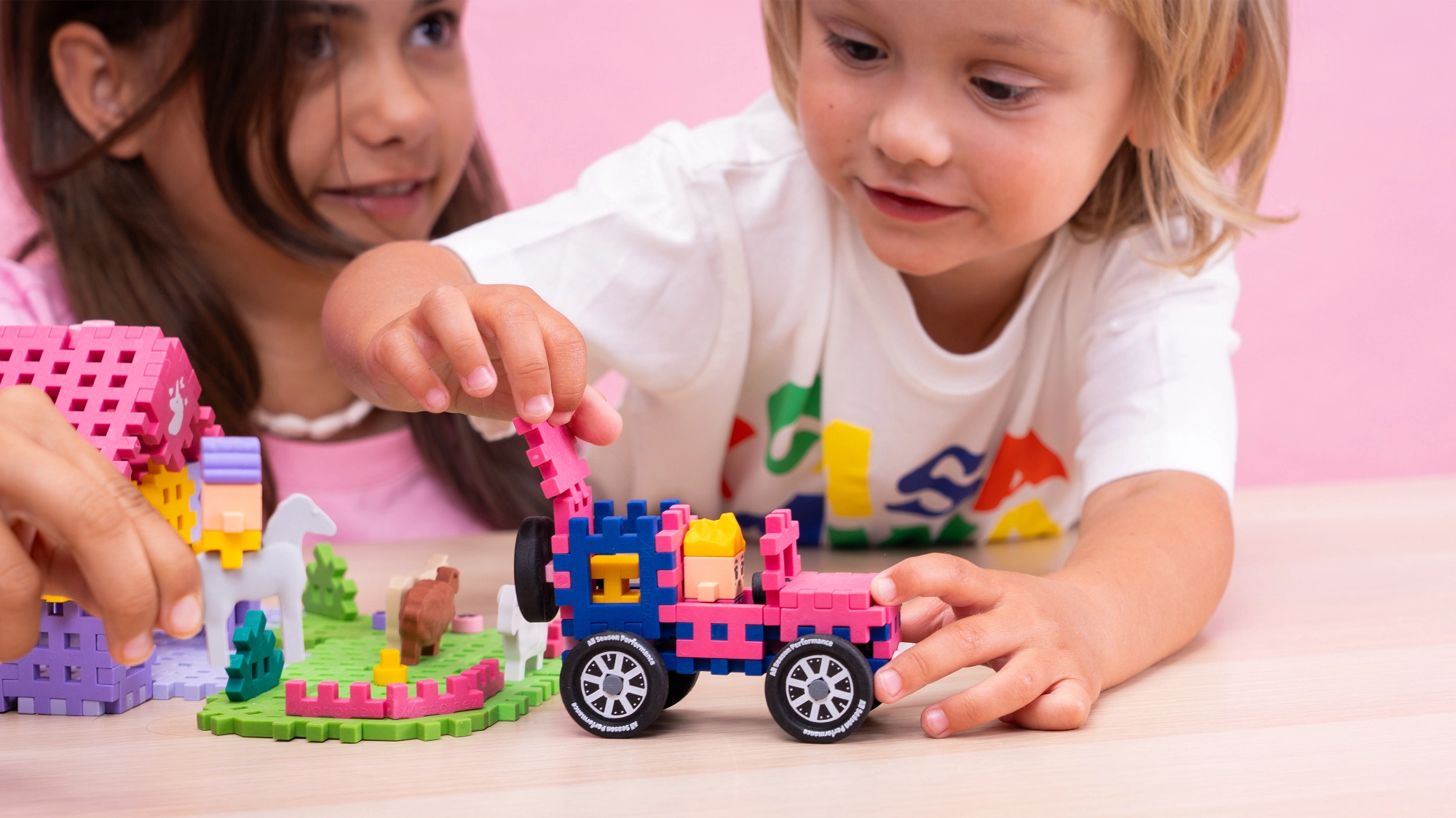 Casetta, recinti, animaletti e dettagli del paesaggio – tutto con i colorati pezzi Mini Waffle che incoraggiano il gioco creativo e lo sviluppo della fantasia.