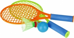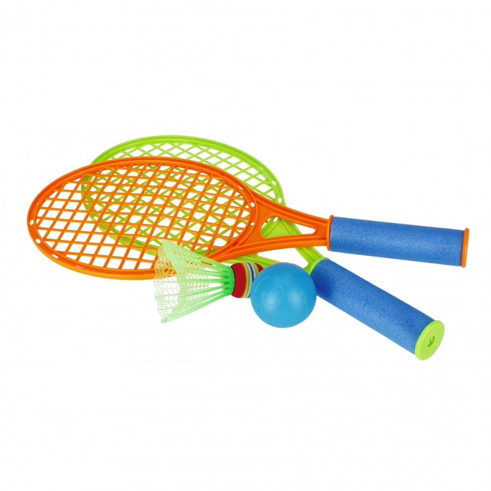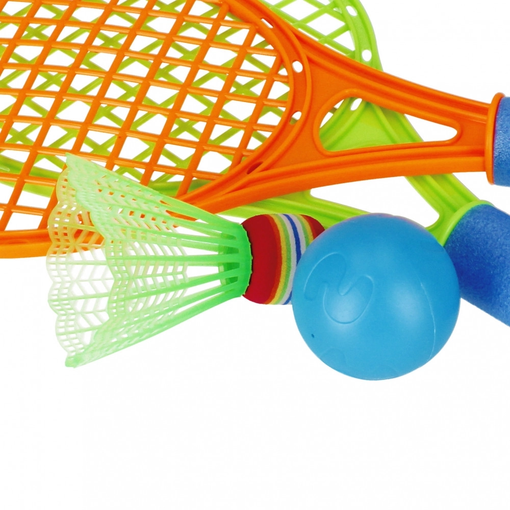 Divertente set di racchette per i più piccoli che offre ore di svago attivo in giardino e in casa. Include 2 racchette leggere, 1 volano da badminton e 1 pallina morbida, ideali per un gioco sicuro. Le dimensioni compatte 41 × 17 × 5 cm e la struttura resistente lo rendono una scelta perfetta per bambini dai 3 anni.