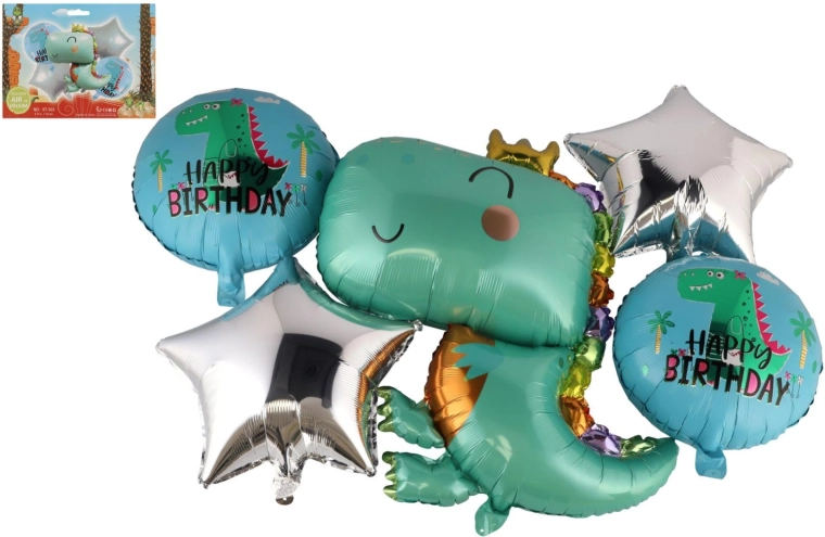 - 5 palloncini (dinosauro con corona, 2× rotondo Happy Birthday, 2× stella)