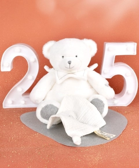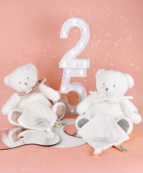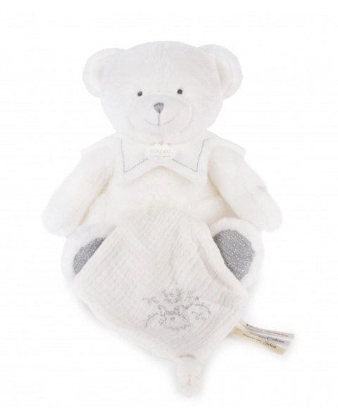 Il materiale morbidissimo, il ricamo DOUDOU e i nastri in raso con messaggi affettuosi trasmettono una sensazione di sicurezza e benessere per le coccole di ogni giorno.