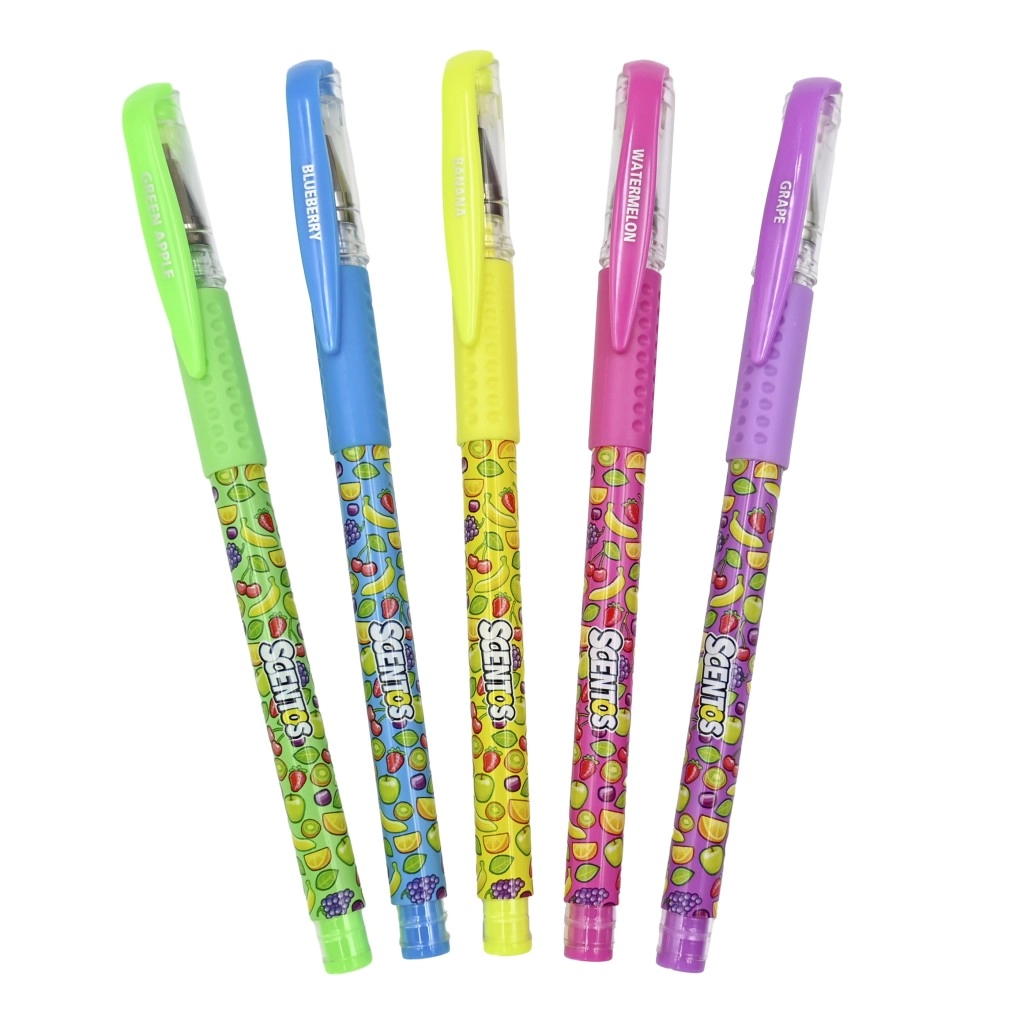 La confezione include cinque profumi e colori: verde (green apple), blu (blueberry), giallo (banana), rosa (watermelon) e viola (grape). Le penne sono realizzate con materiali atossici e soddisfano i requisiti per forniture scolastiche sicure.