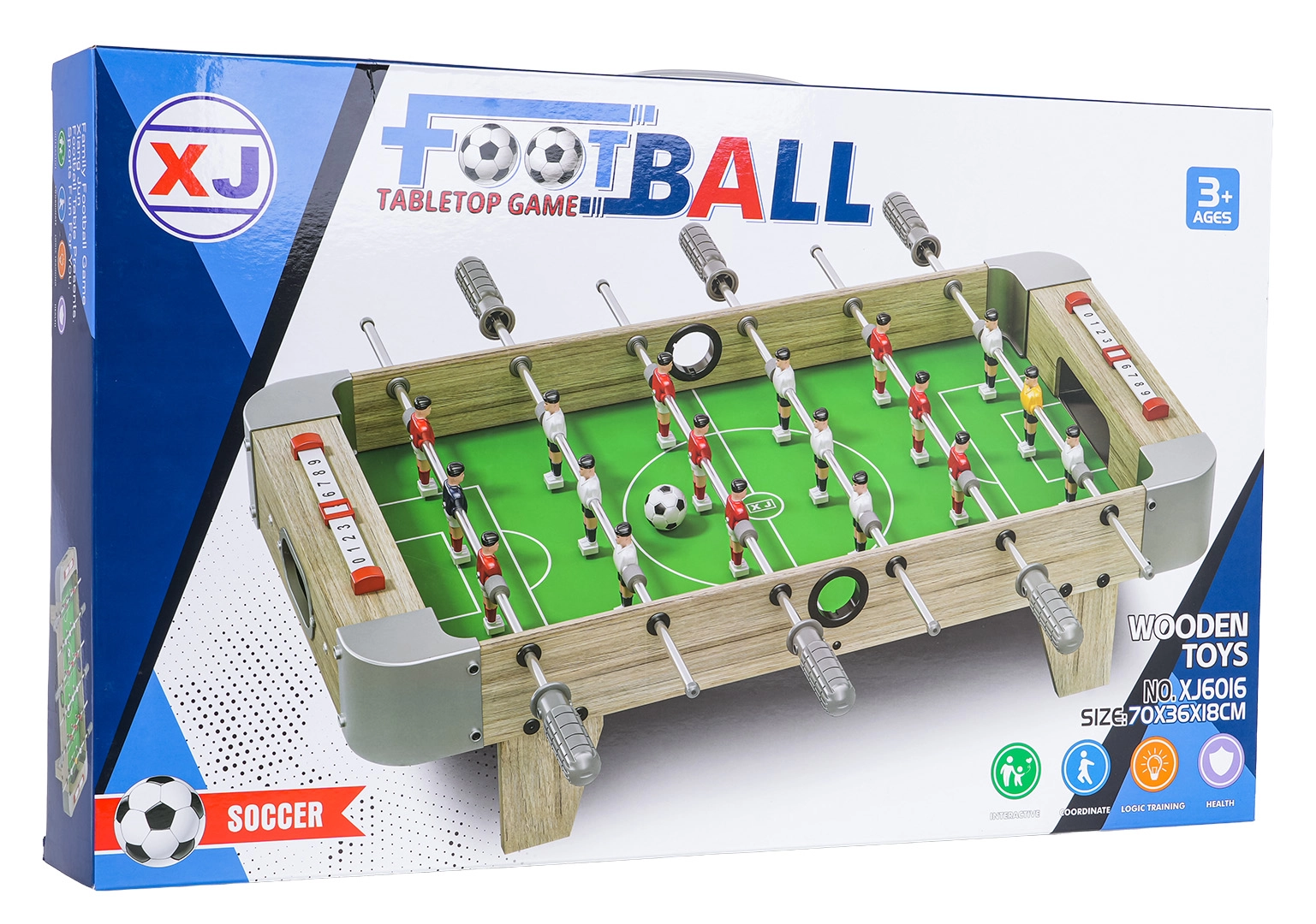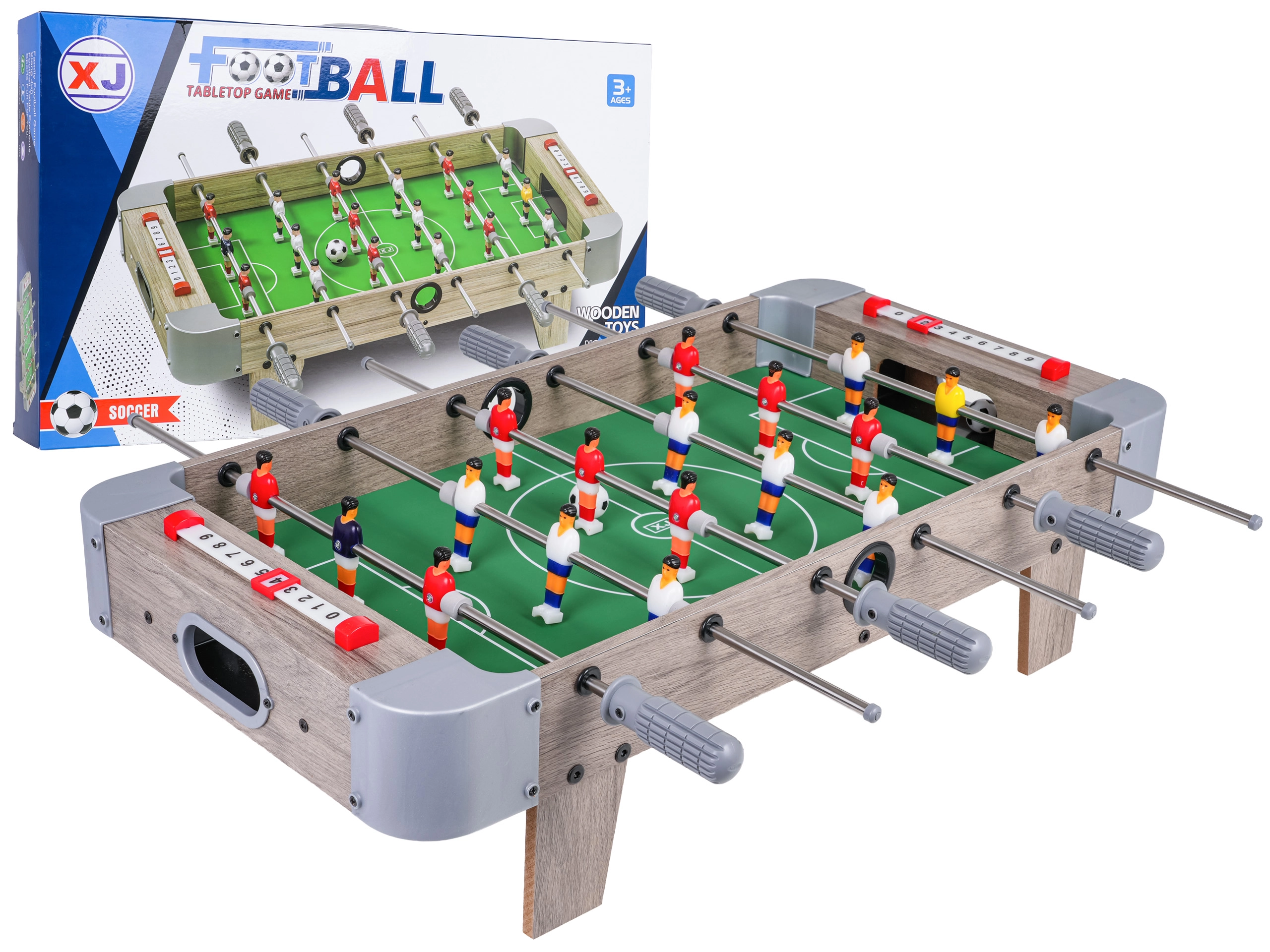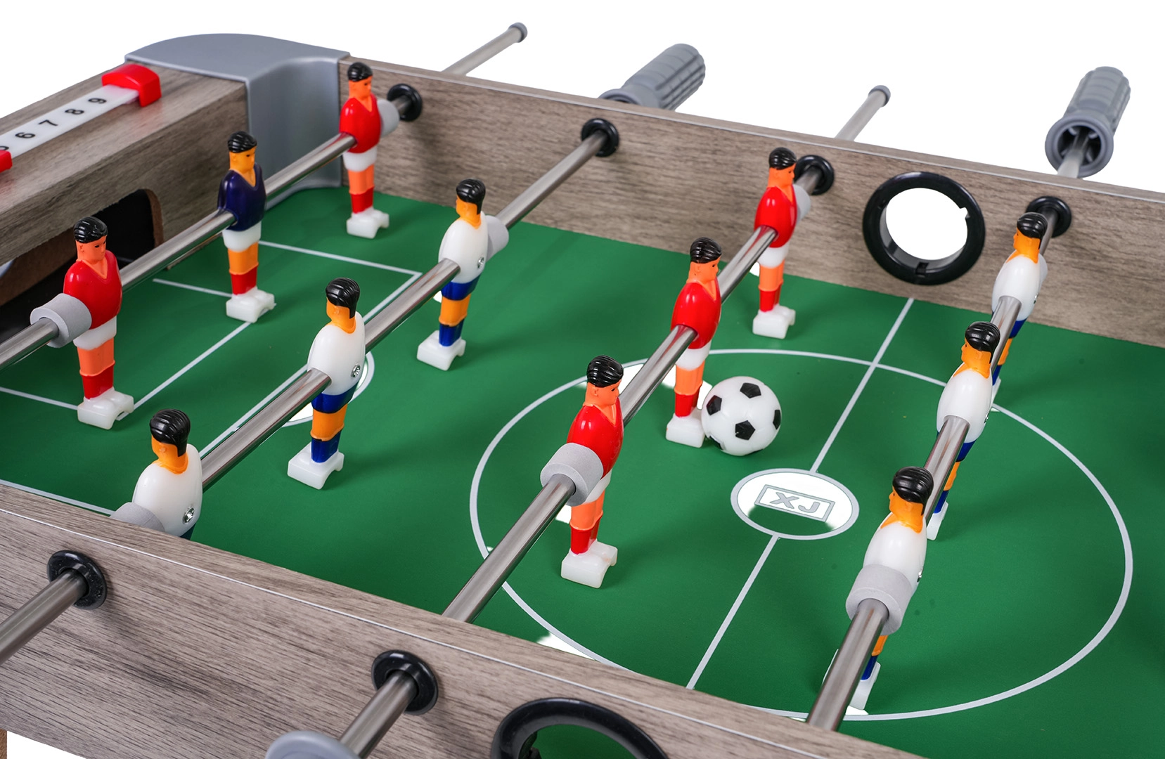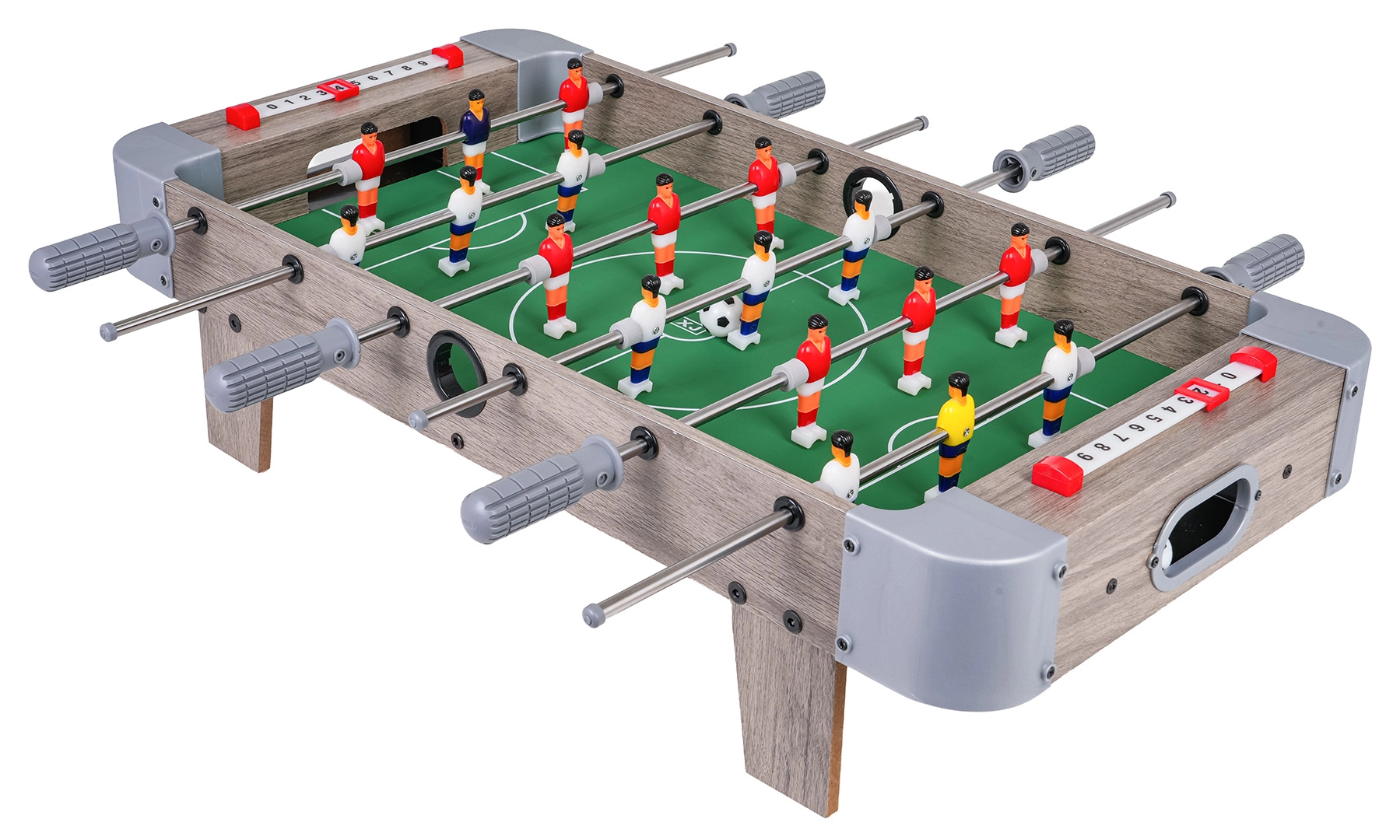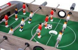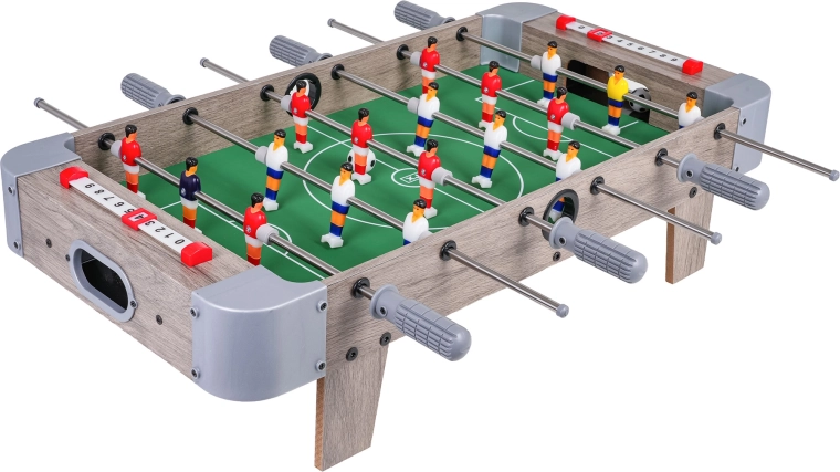 Questo calcio balilla combina dimensioni compatte e costruzione resistente, così da entrare su qualsiasi tavolo e seguirti ovunque. Il campo verde con marcature chiare, le miniature realistiche dei giocatori e le aste metalliche scorrevoli garantiscono un gioco dinamico e corretto.