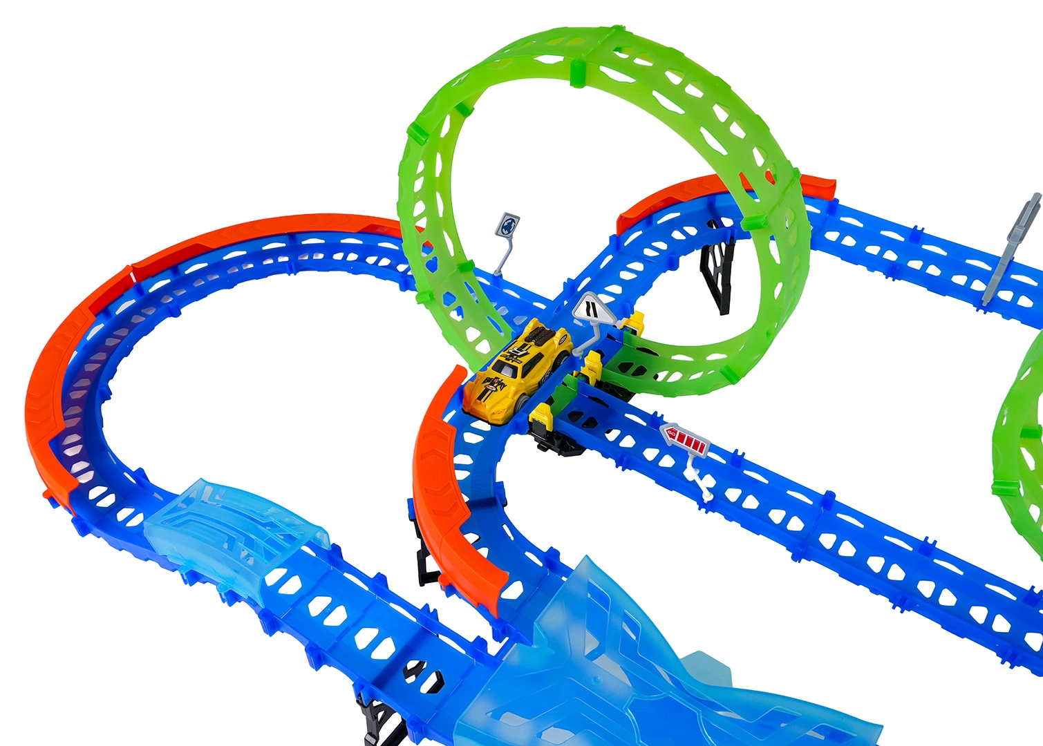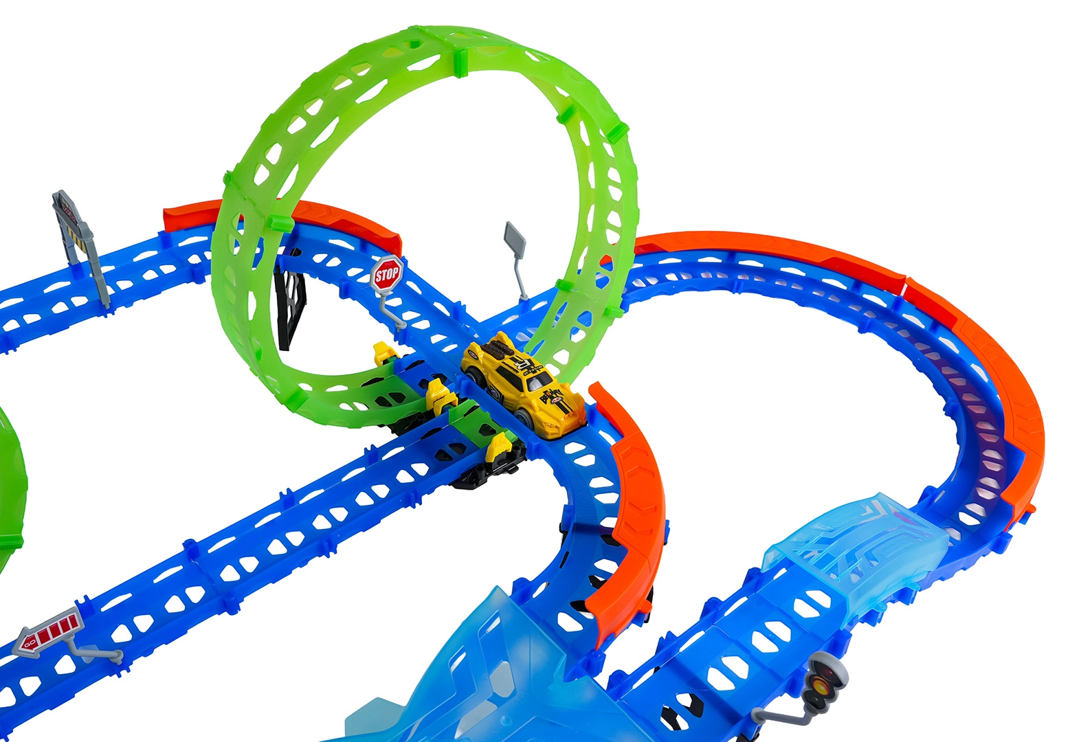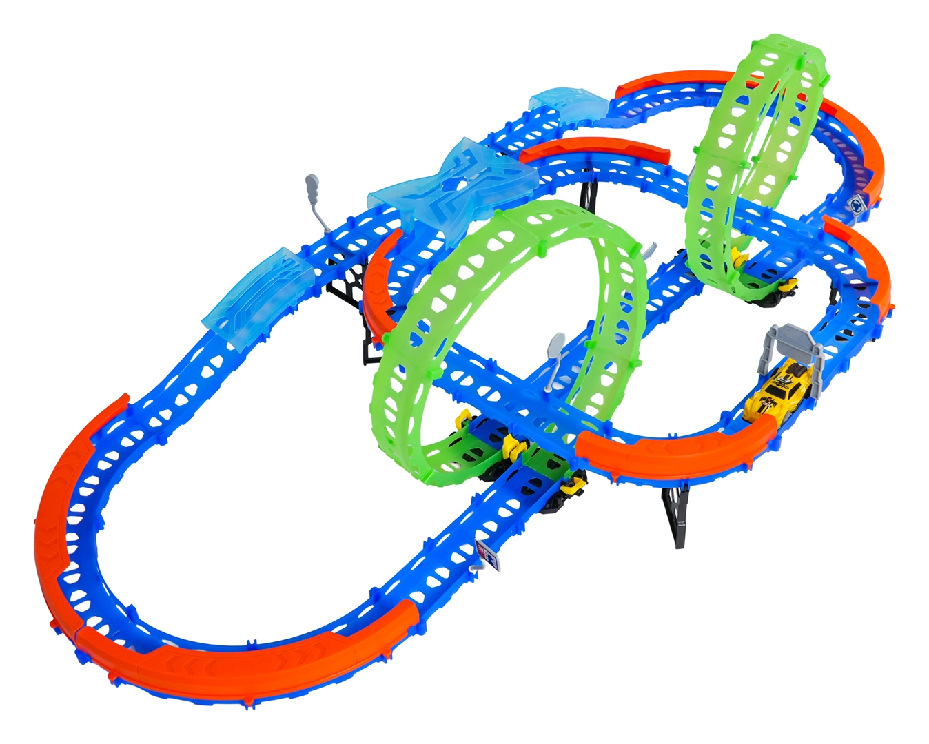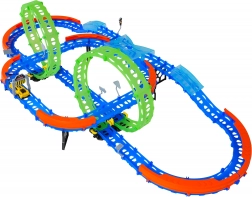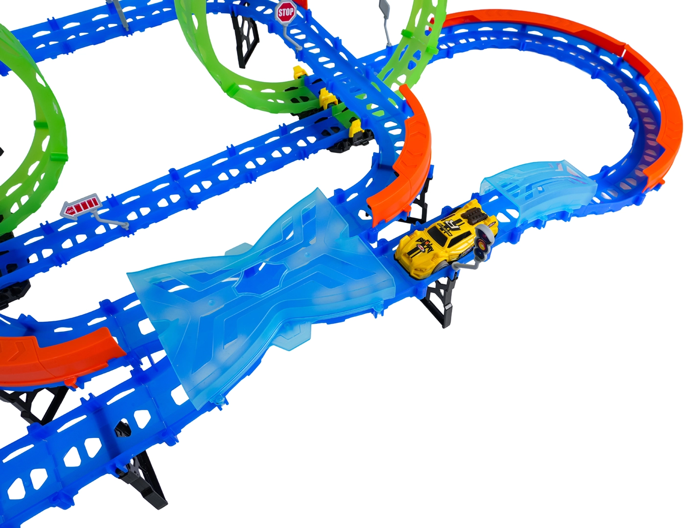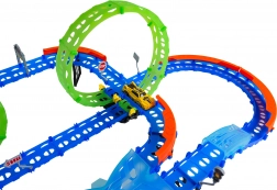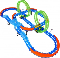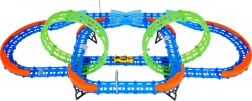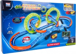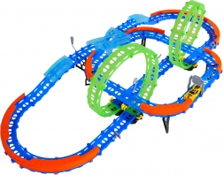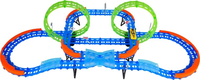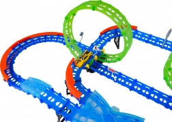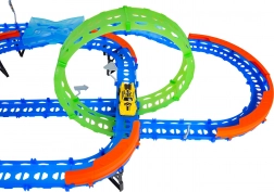 Costruisci un tracciato colorato con ponti, curve e due loop e guarda la macchinina sfrecciare ad alta velocità. Gli elementi fluorescenti si illuminano al buio dopo l’esposizione alla luce, rendendo le gare ancora più dinamiche e divertenti.