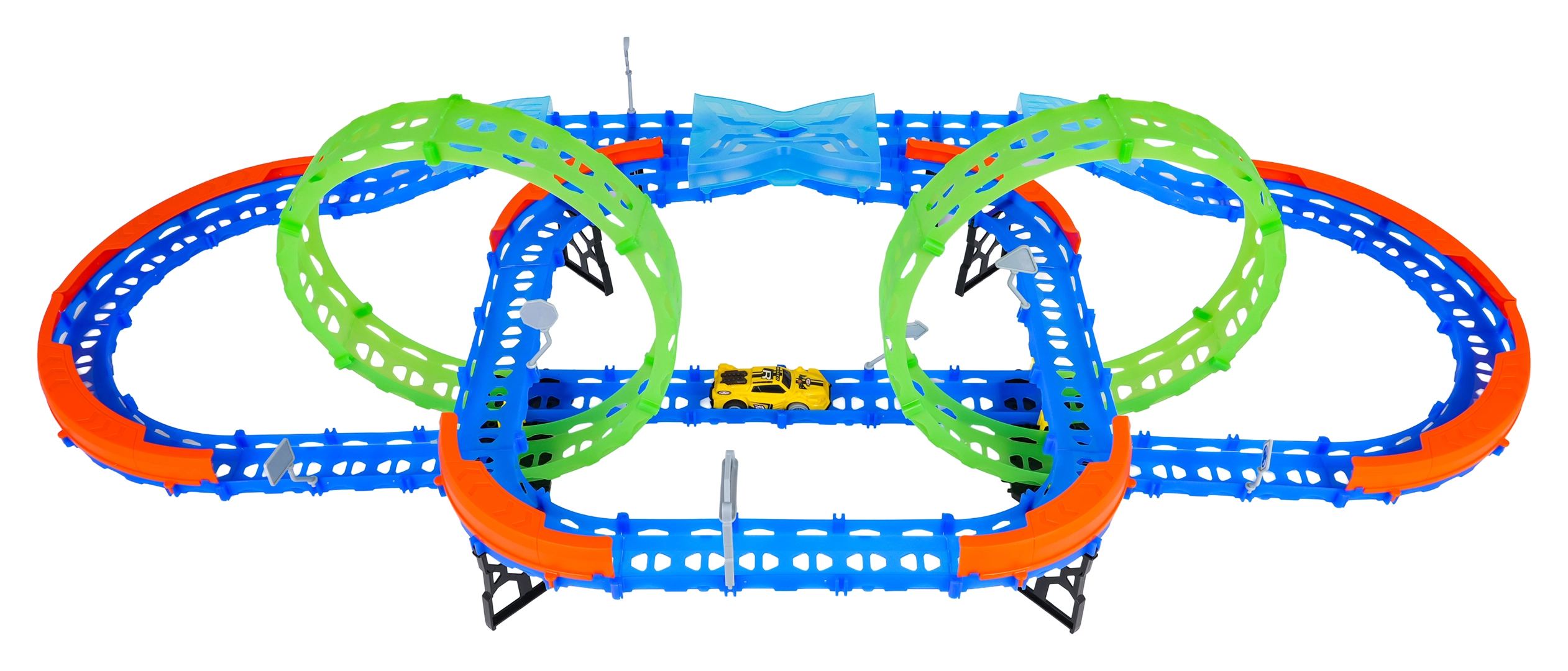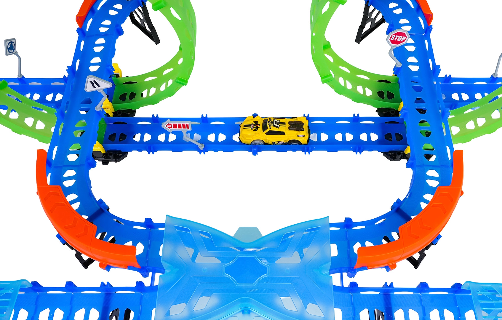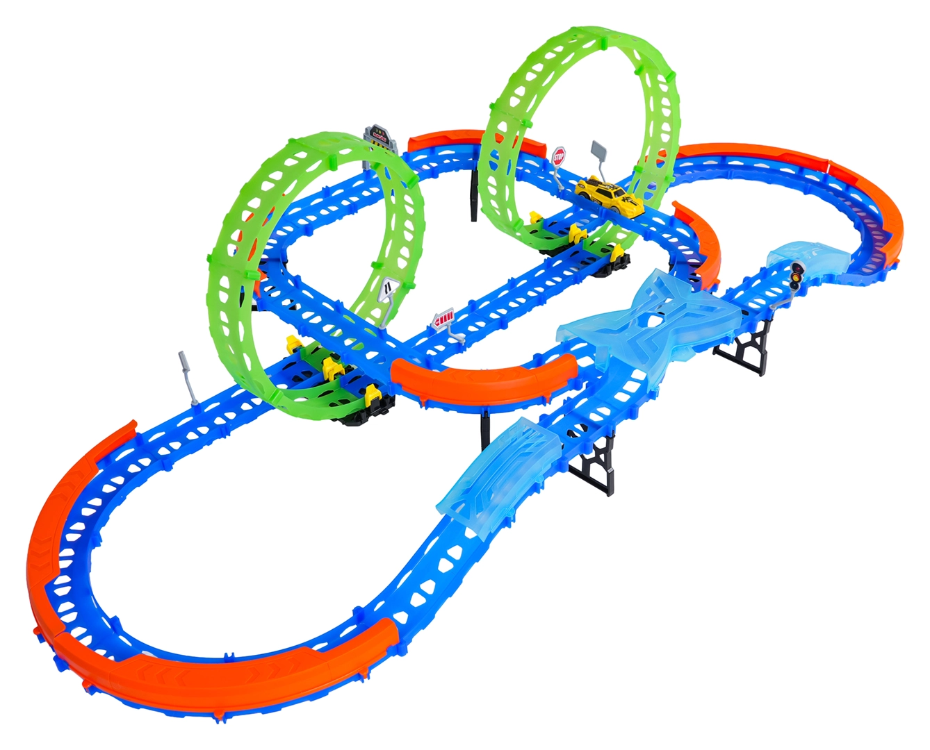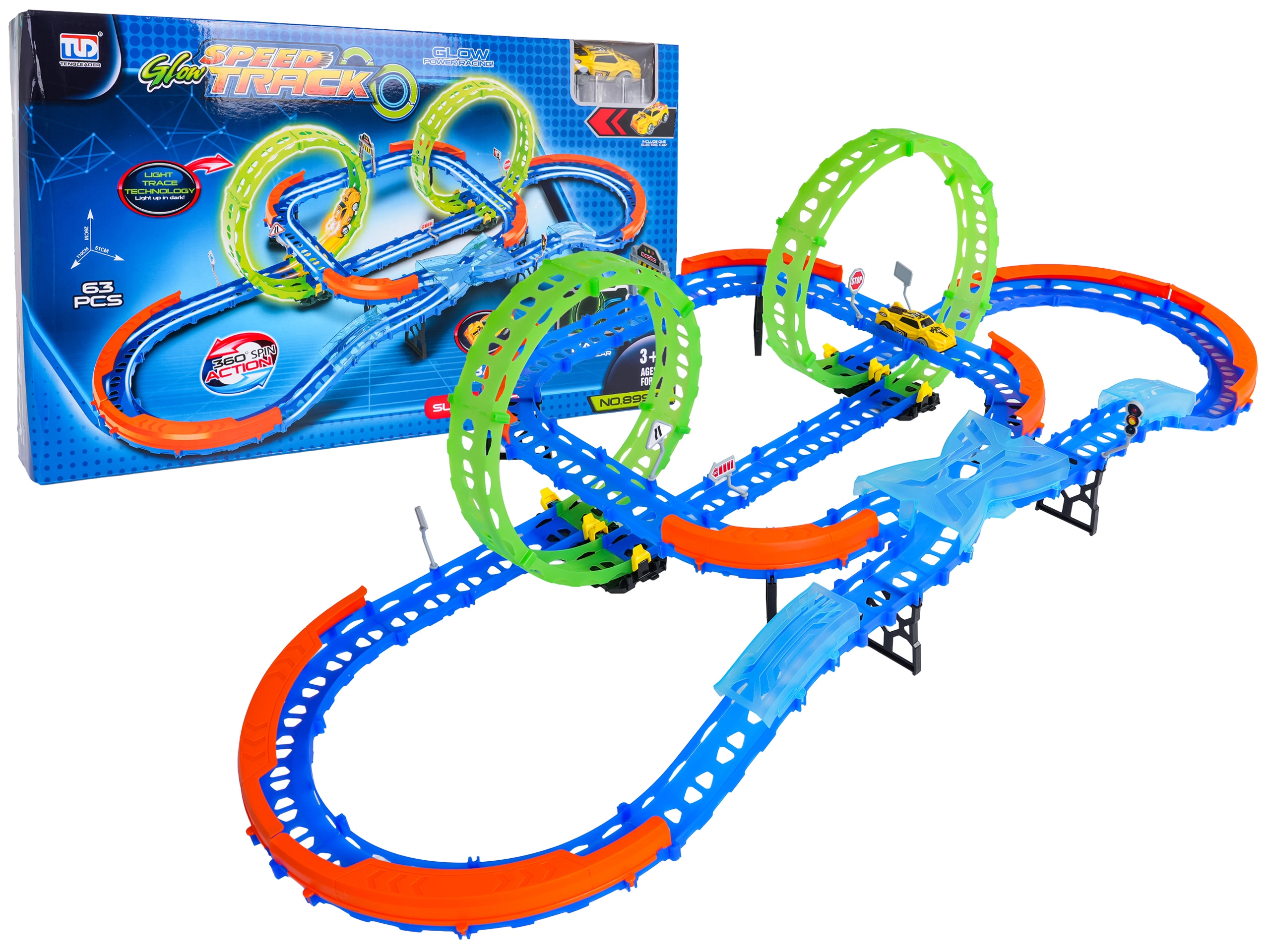 Costruisci un tracciato colorato con ponti, curve e due loop e guarda la macchinina sfrecciare ad alta velocità. Gli elementi fluorescenti si illuminano al buio dopo l’esposizione alla luce, rendendo le gare ancora più dinamiche e divertenti.