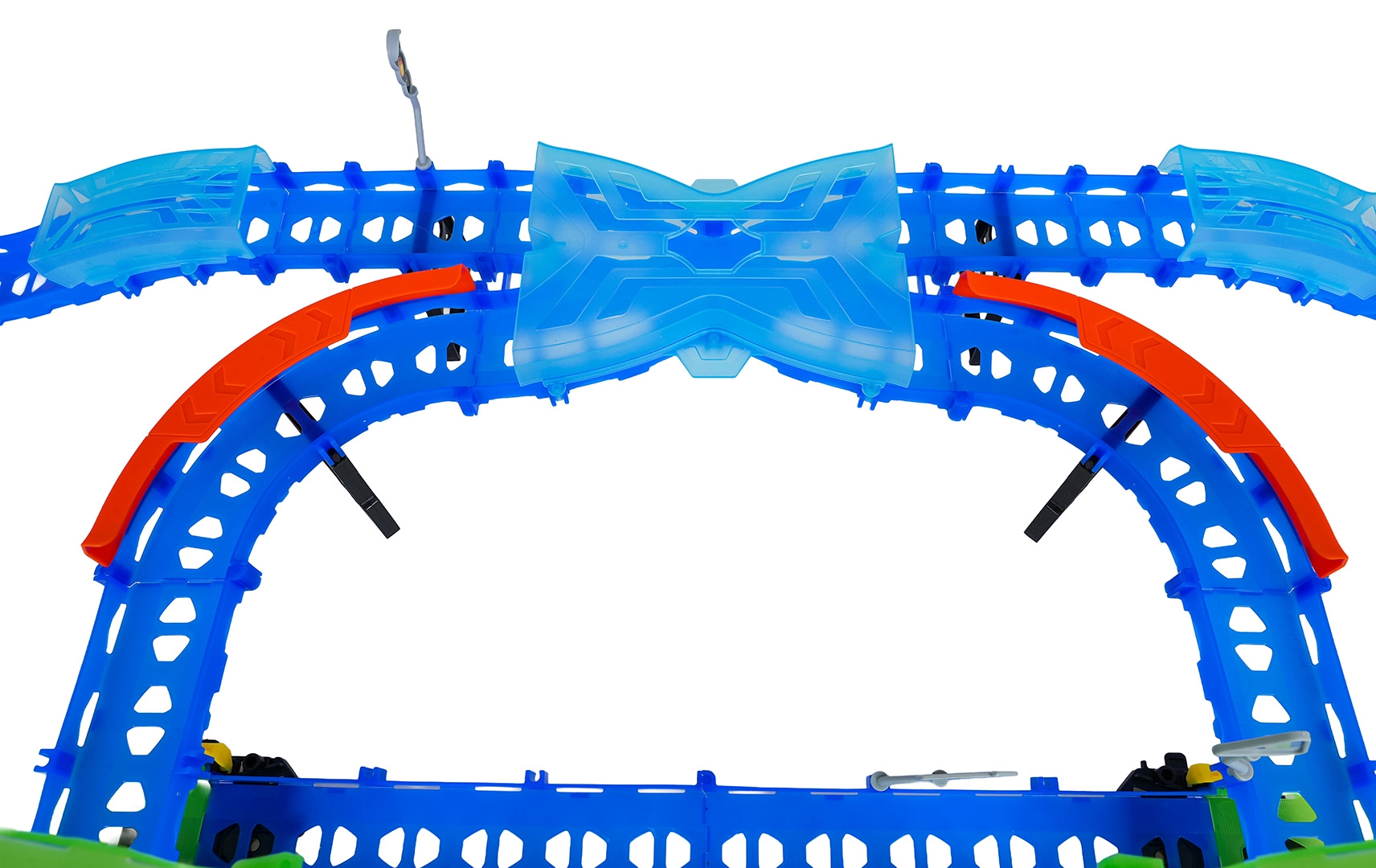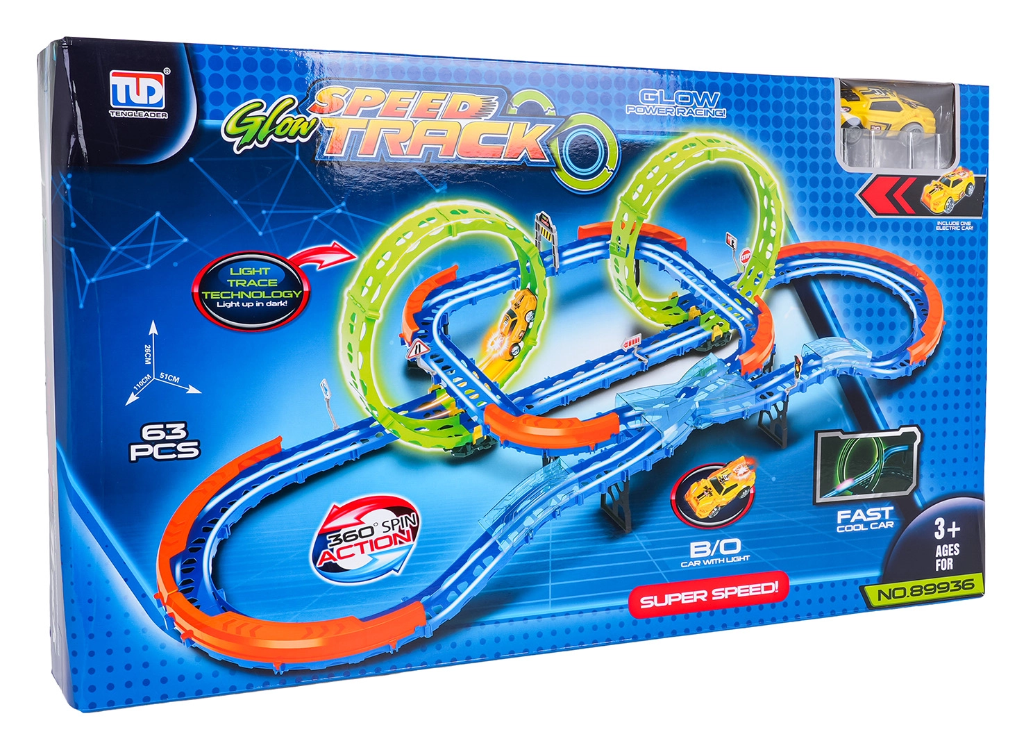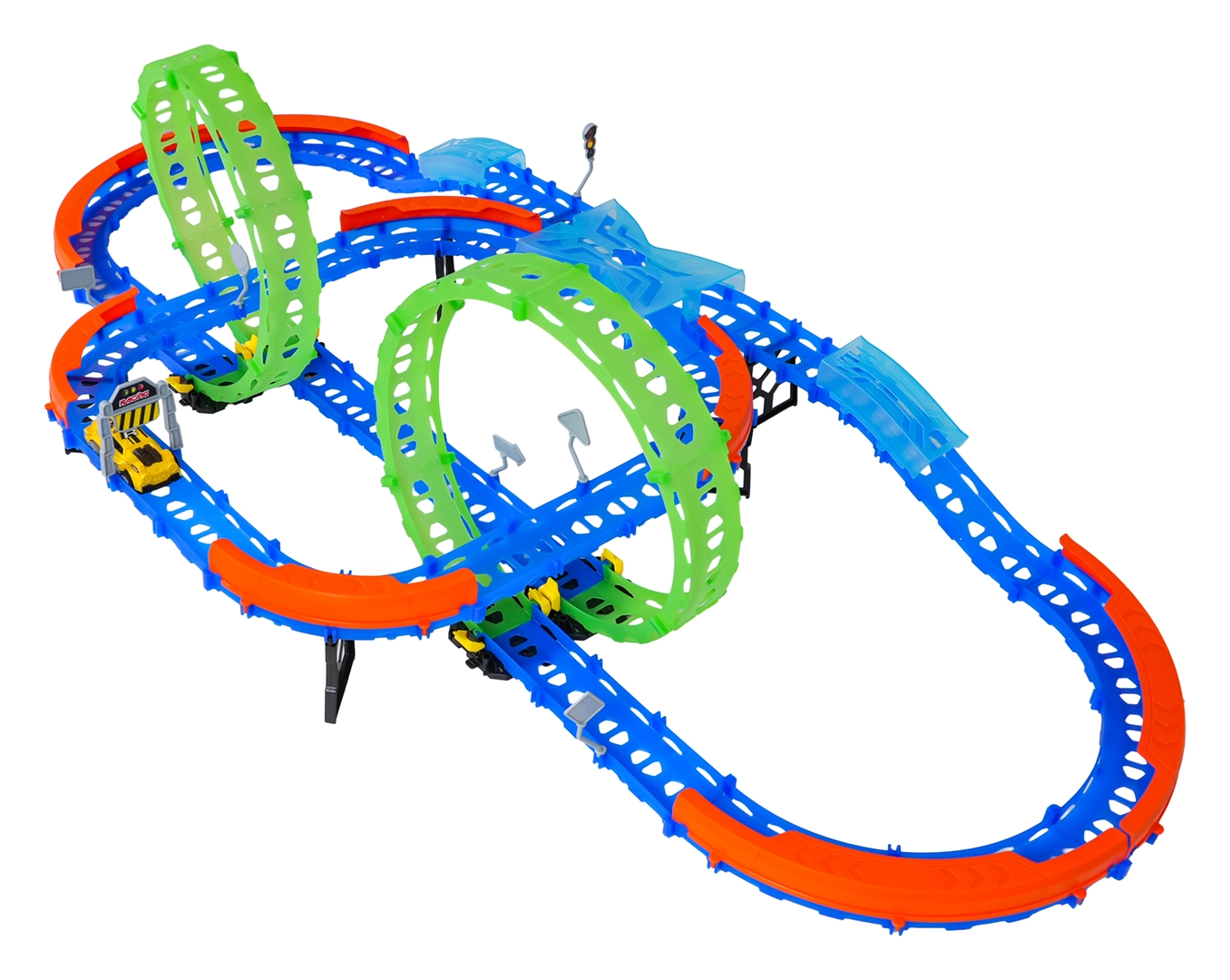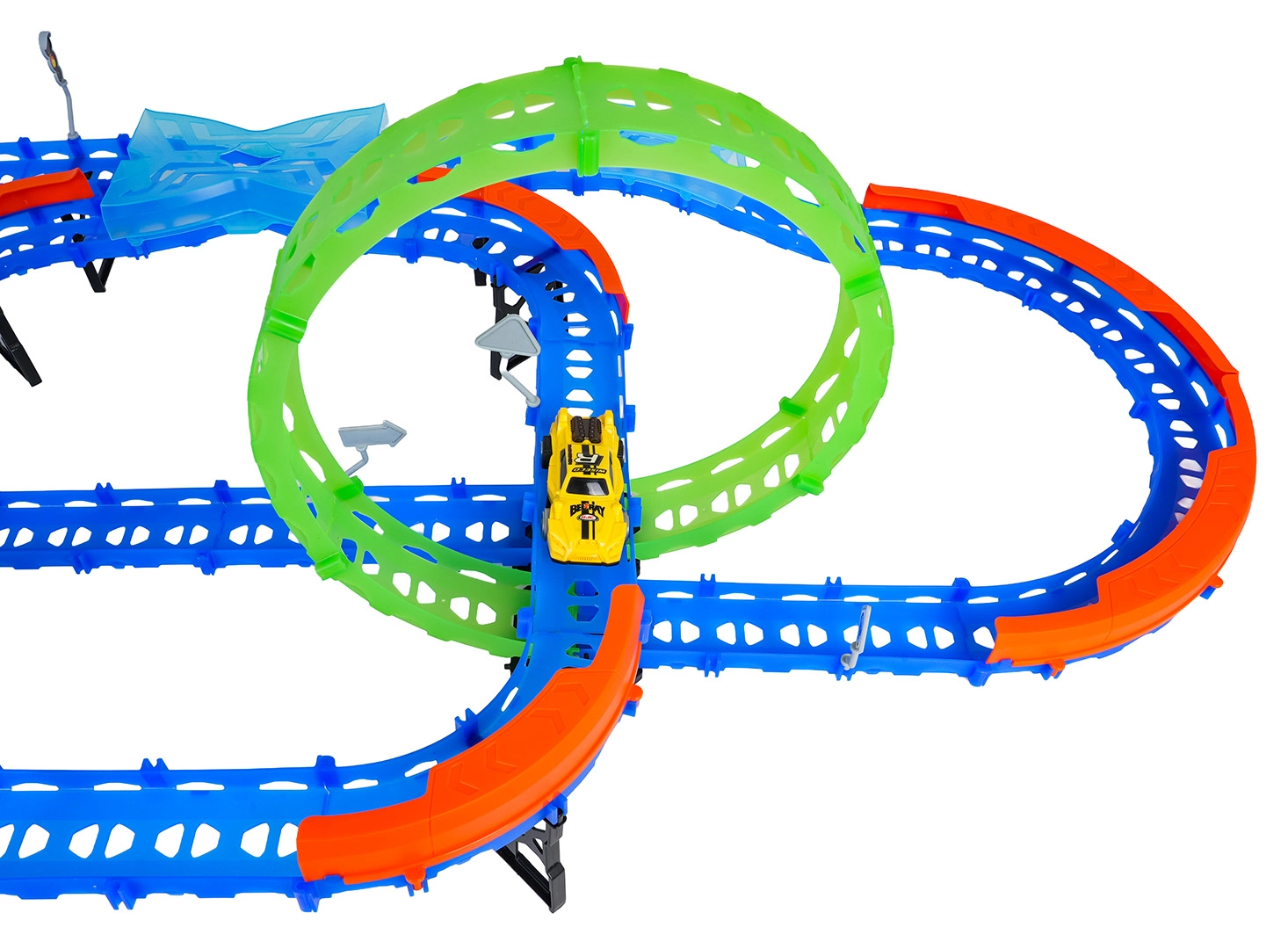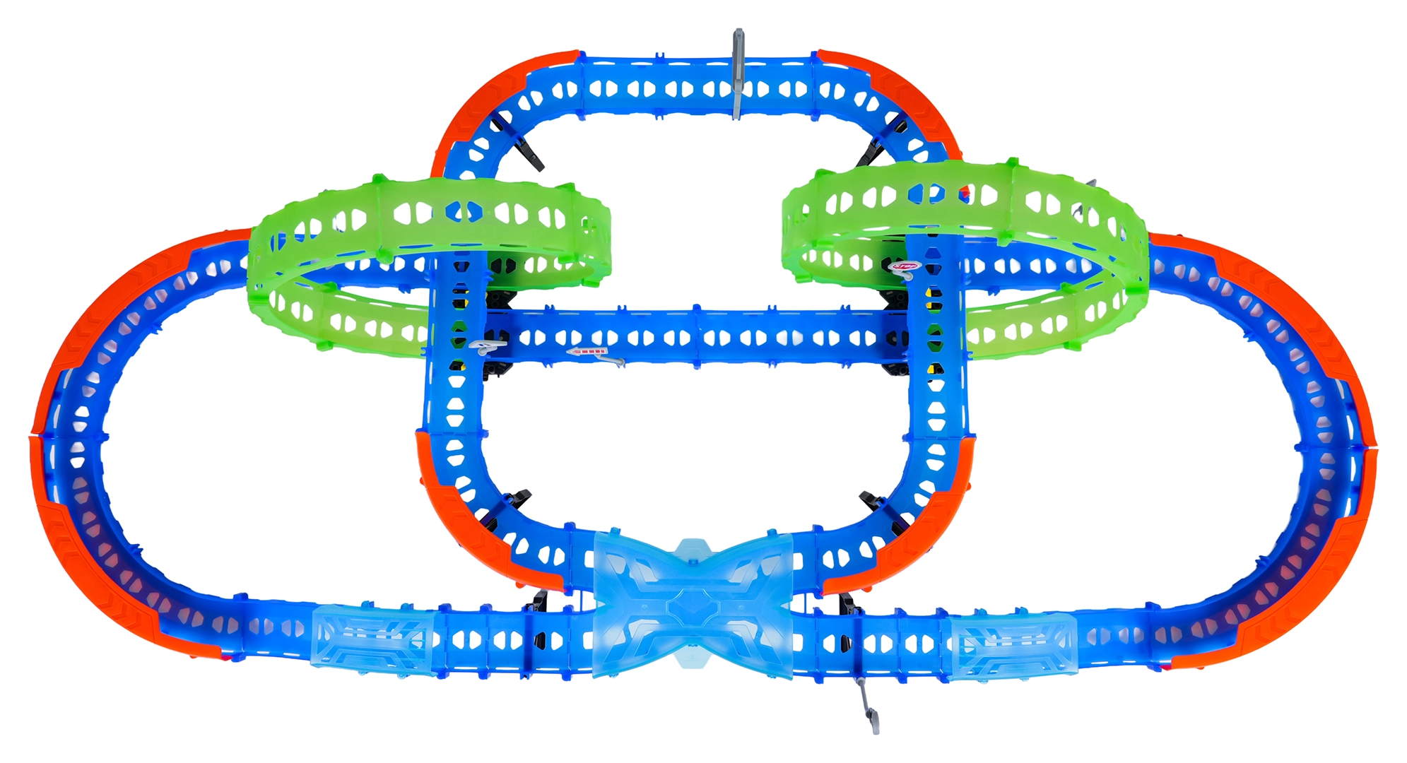 Costruisci un tracciato colorato con ponti, curve e due loop e guarda la macchinina sfrecciare ad alta velocità. Gli elementi fluorescenti si illuminano al buio dopo l’esposizione alla luce, rendendo le gare ancora più dinamiche e divertenti.