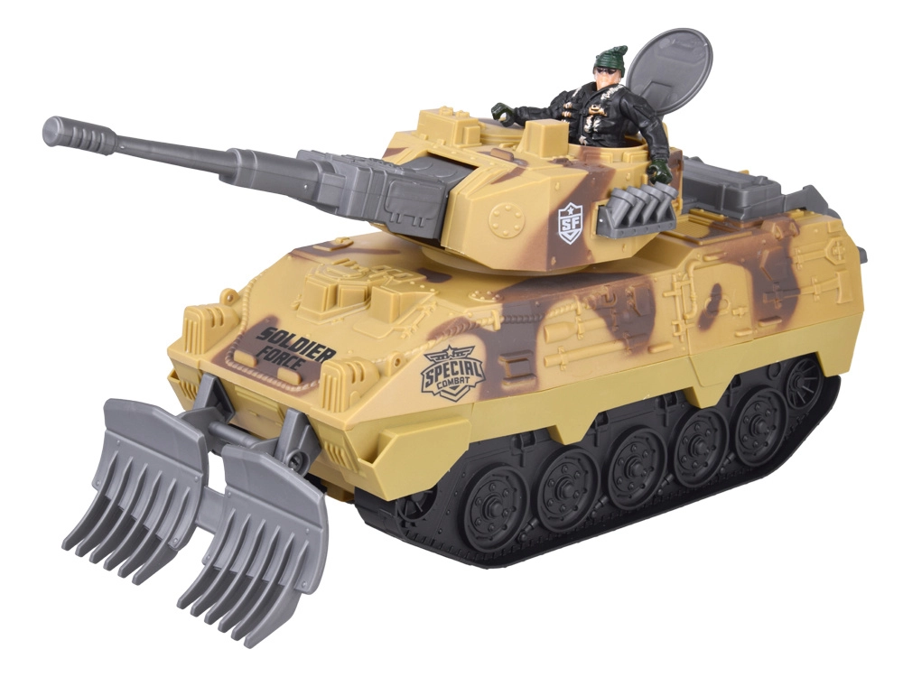 Carro armato dettagliato con mimetica desertica, dotato di torretta girevole, cannone alzabile, portello apribile per la minifigurina e lama frontale per “sgomberare” gli ostacoli. Perfetto per manovre realistiche.