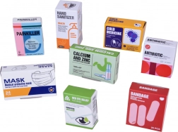 Stetoscopio con suoni del cuore, termometro elettronico, siringa, forbici, pinzette, otoscopio, “medicine” in flaconcini e scatoline: tutto per un ambulatorio completo.
