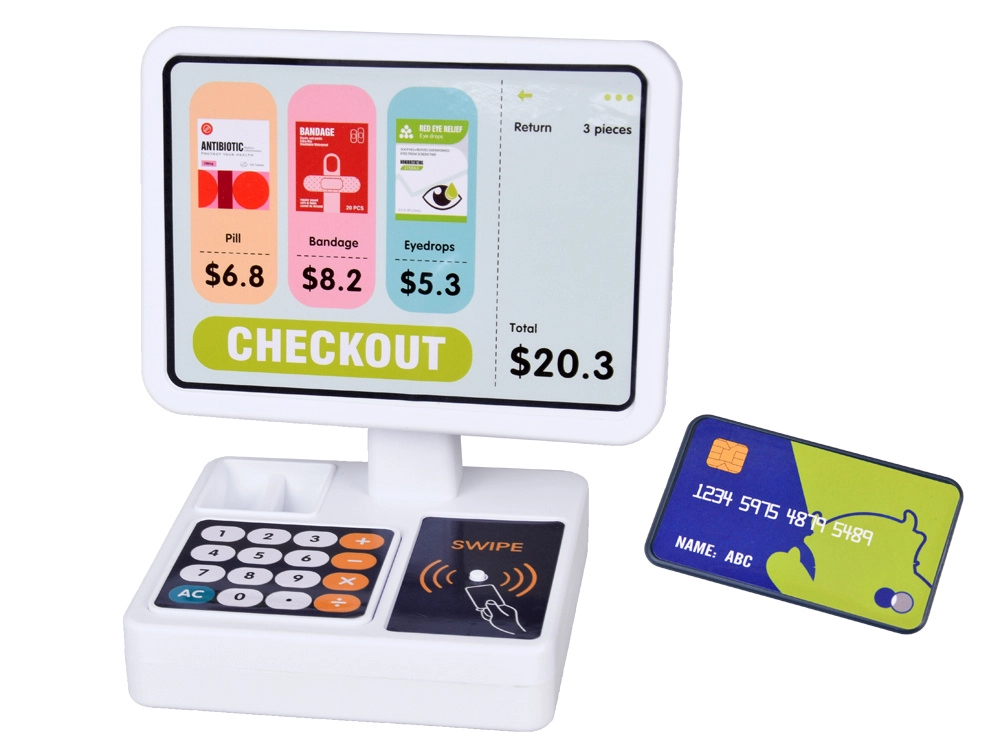I bambini possono esercitarsi a pagare con carta e in contanti. Display, tasti e lettore di carte con effetti sonori conferiscono al gioco un tocco realistico e un divertimento educativo.