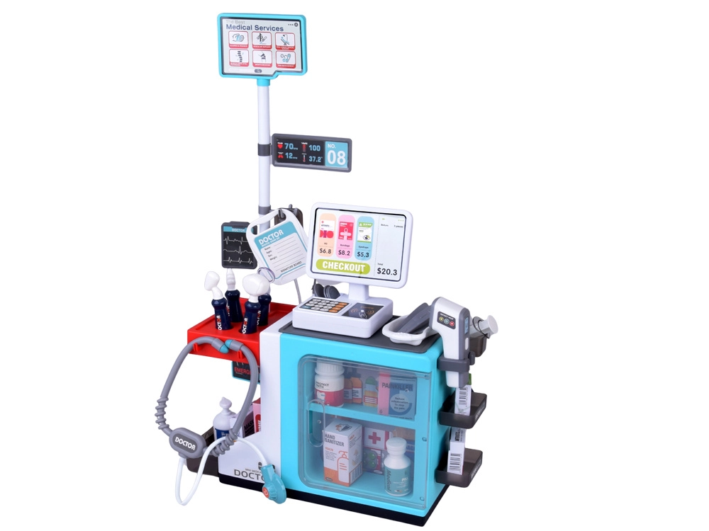 Include una cassa con terminale (pagamento con carta e “contanti”), uno stetoscopio con battito cardiaco, un termometro elettronico e numerosi strumenti medici e scatoline di “farmaci”. Il set sviluppa comunicazione, motricità fine e alfabetizzazione finanziaria di base.