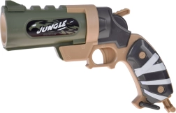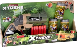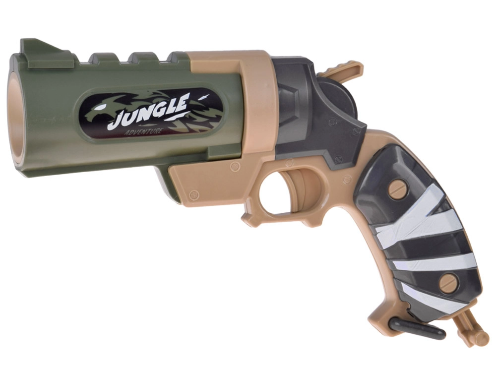 - 1× pistola JUNGLE, 6× dardo in gommapiuma (punta in gomma), 3× bersaglio in plastica – lattina