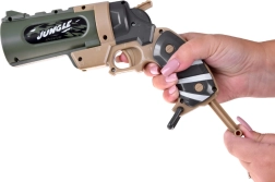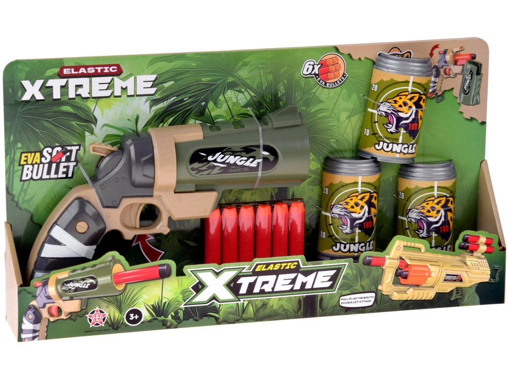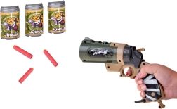 Il set JUNGLE è un’ottima scelta per giochi d’azione all’aperto e in casa. La pistola leggera e resistente si adatta comodamente alla mano del bambino, i colpi in morbida gommapiuma con punta in gomma assicurano un gioco più sicuro e i bersagli a forma di lattine motivano ad allenare la precisione. Basta caricare, mirare e abbattere i bersagli.