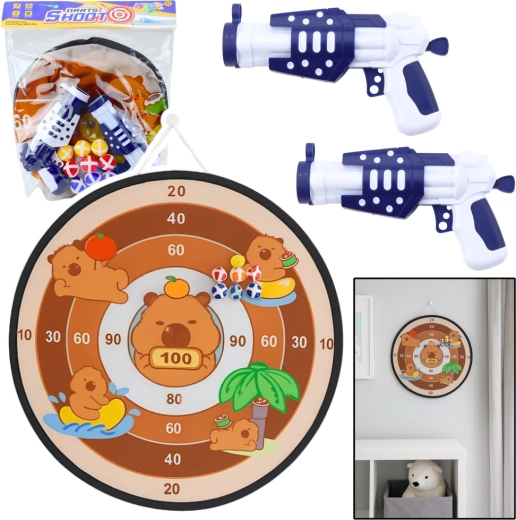 Divertente gioco da bersaglio a tema capibara per 2 giocatori che sviluppa precisione, riflessi e coordinazione mano-occhio. Grande pannello bersaglio da 73,5 cm, 2 pistolette e 9 palline di sicurezza con velcro per un divertimento dinamico ma sicuro in casa e in giardino. Senza batterie, facile da appendere con gancio a ventosa.