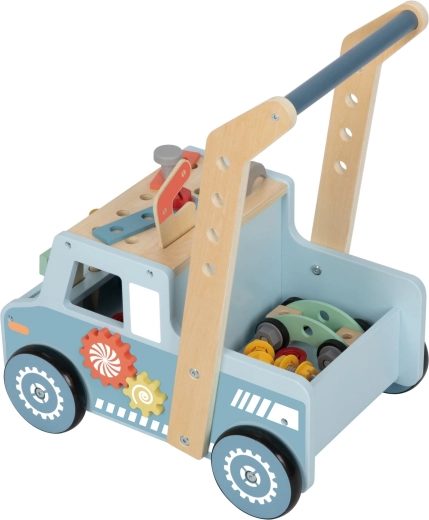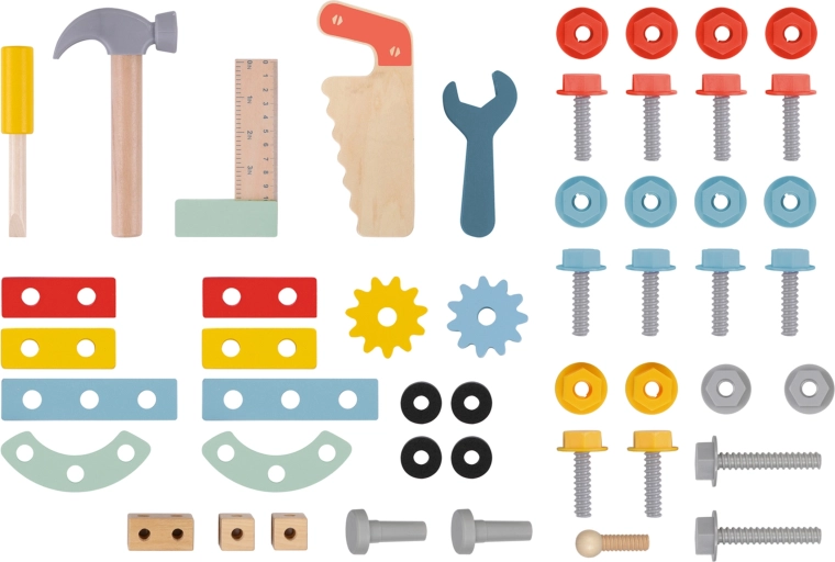 Grazie alle strisce in gomma sulle ruote, la marcia è silenziosa e delicata sul pavimento. L’impugnatura ergonomica si adatta alla mano del bambino e il vano posteriore per gli attrezzi contiene tutti i componenti. Inclusa una ricca dotazione di utensili in legno e minuteria per infinite varianti di costruzione.