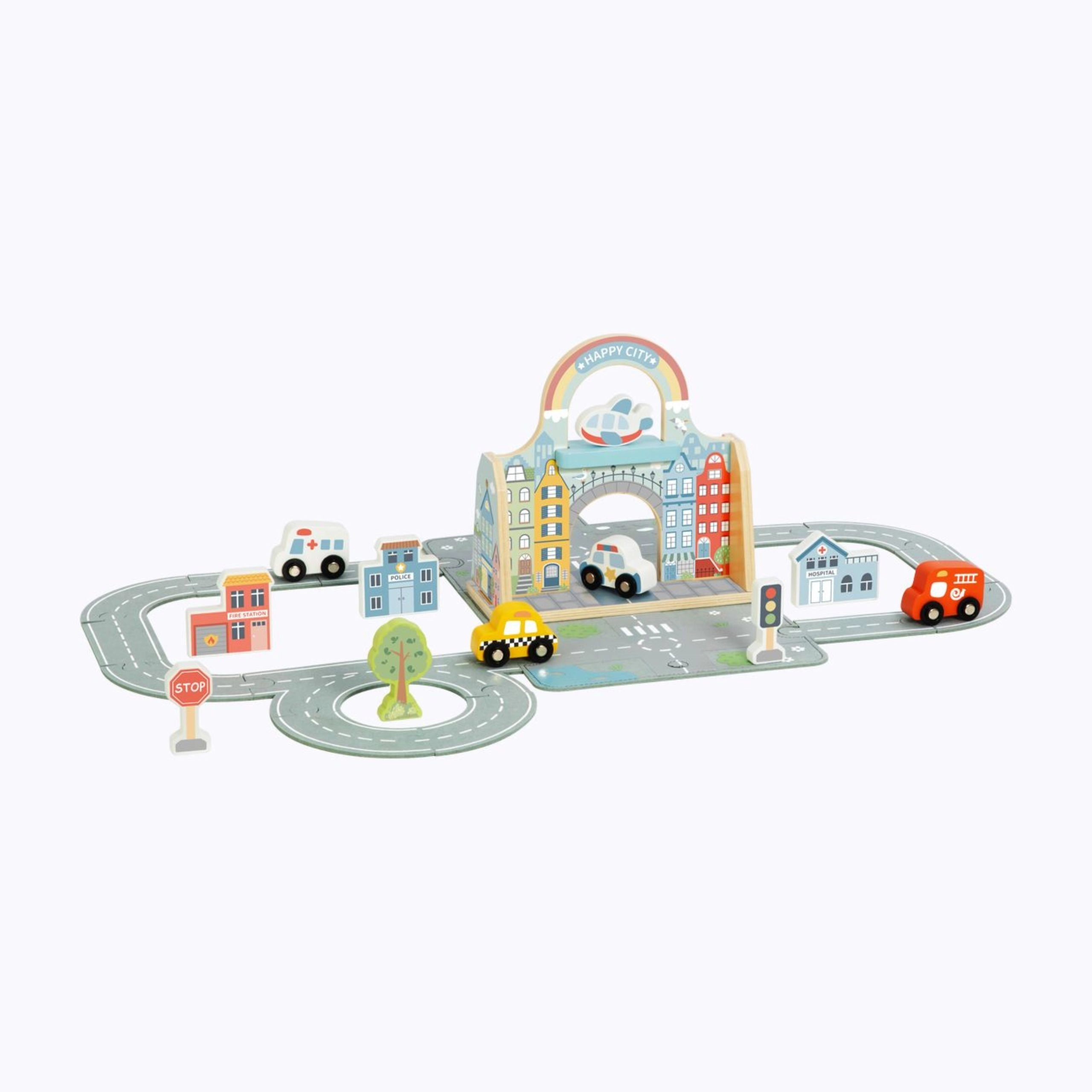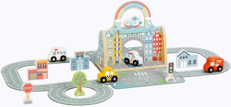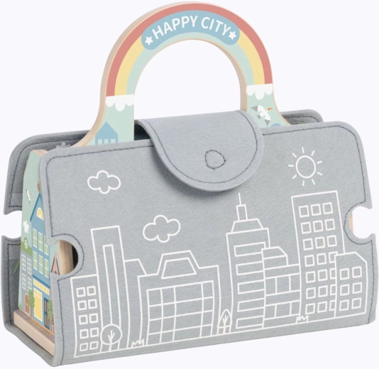 Scopri la magica mini città portatile di Tooky Toy – un set compatto in una elegante borsa che si apre in una scena di gioco completa con strade, edifici, segnali e veicoli. Grazie alla borsa pieghevole, ai pezzi stradali elastici e ai colorati elementi in legno, i bambini possono creare storie ovunque e in qualsiasi momento.