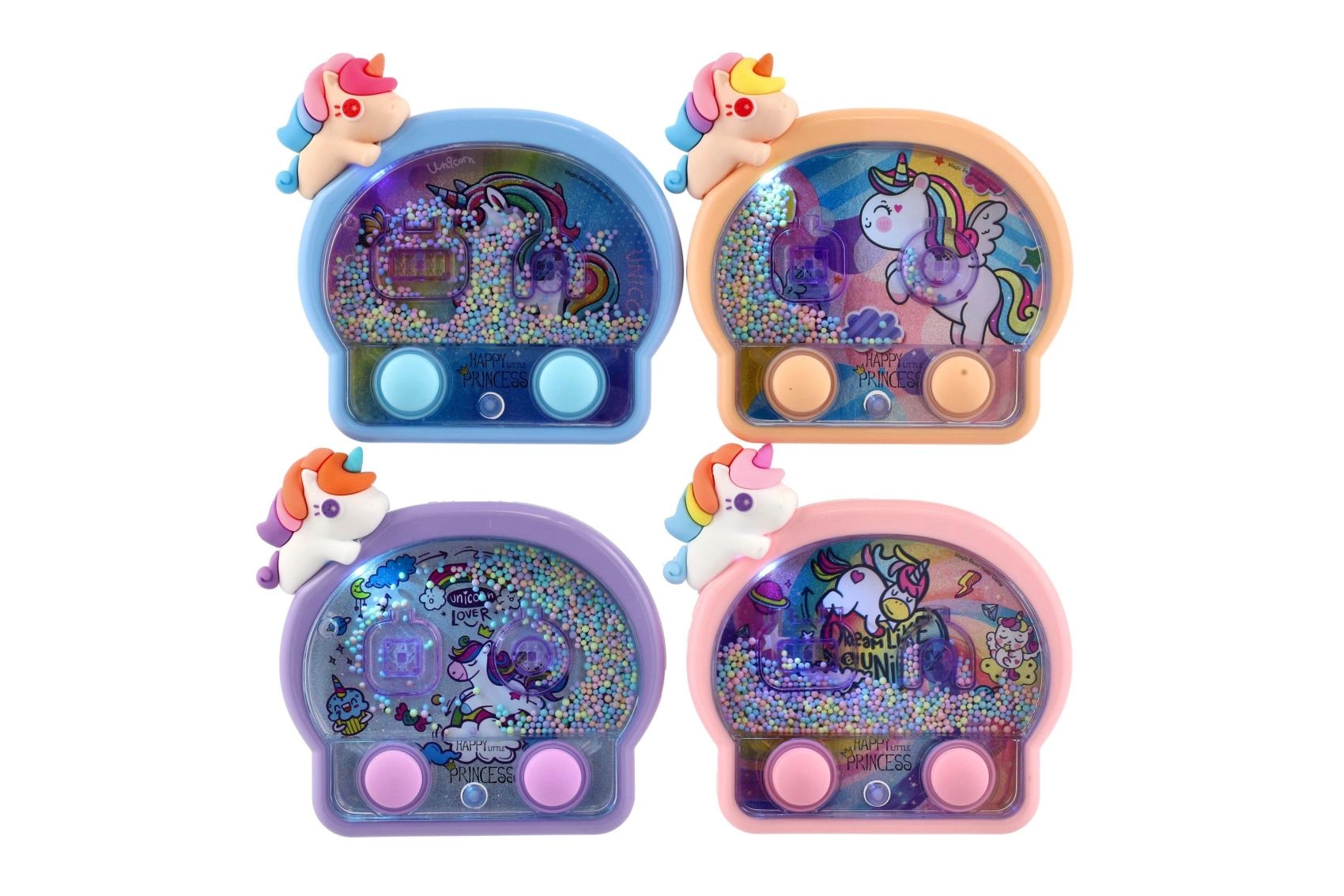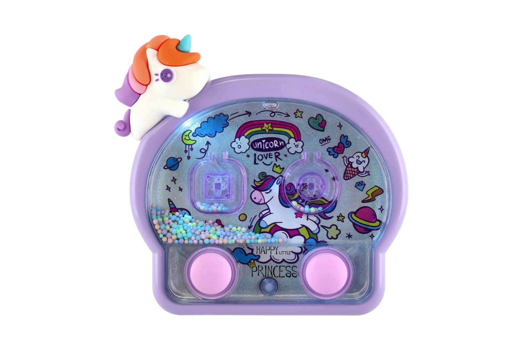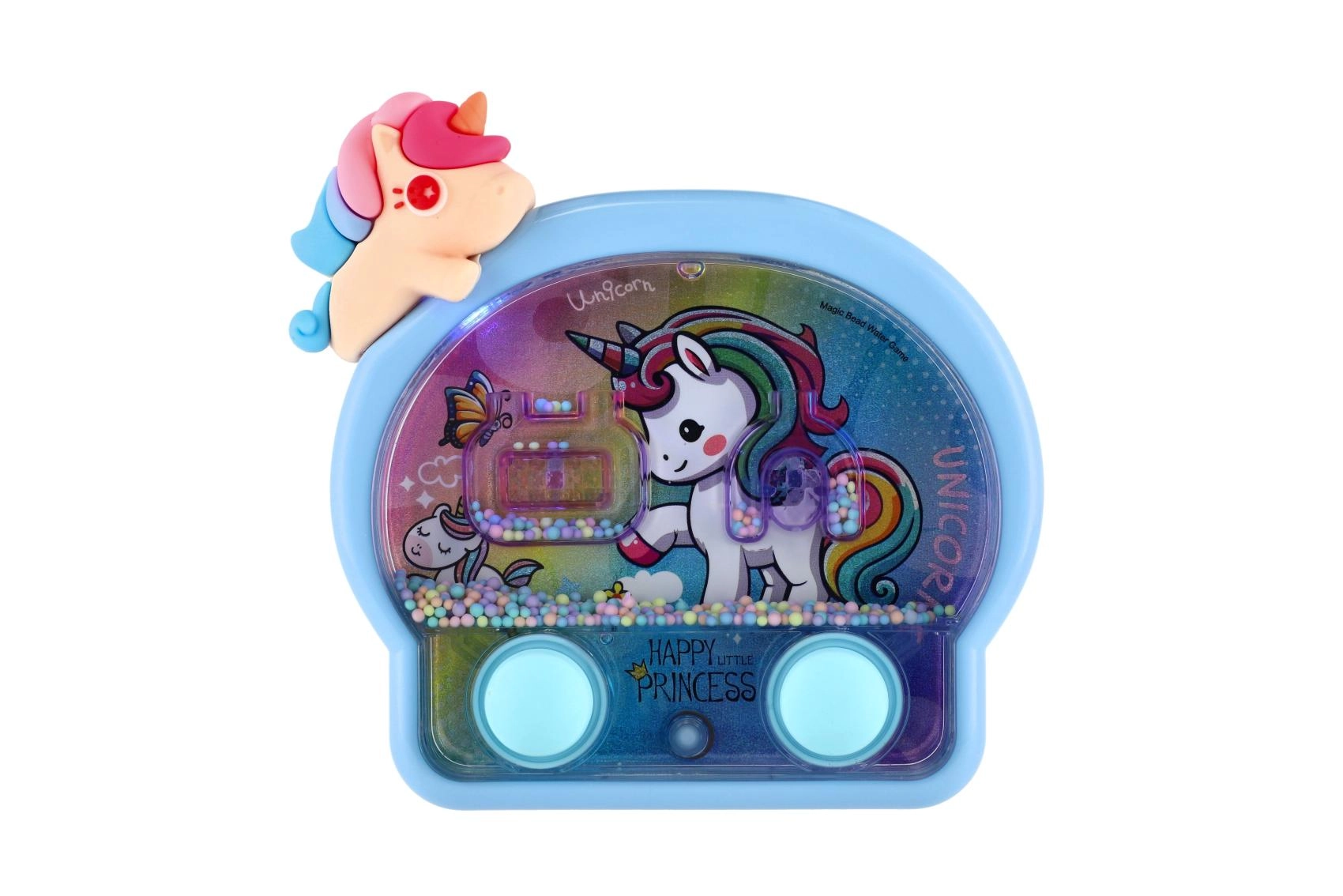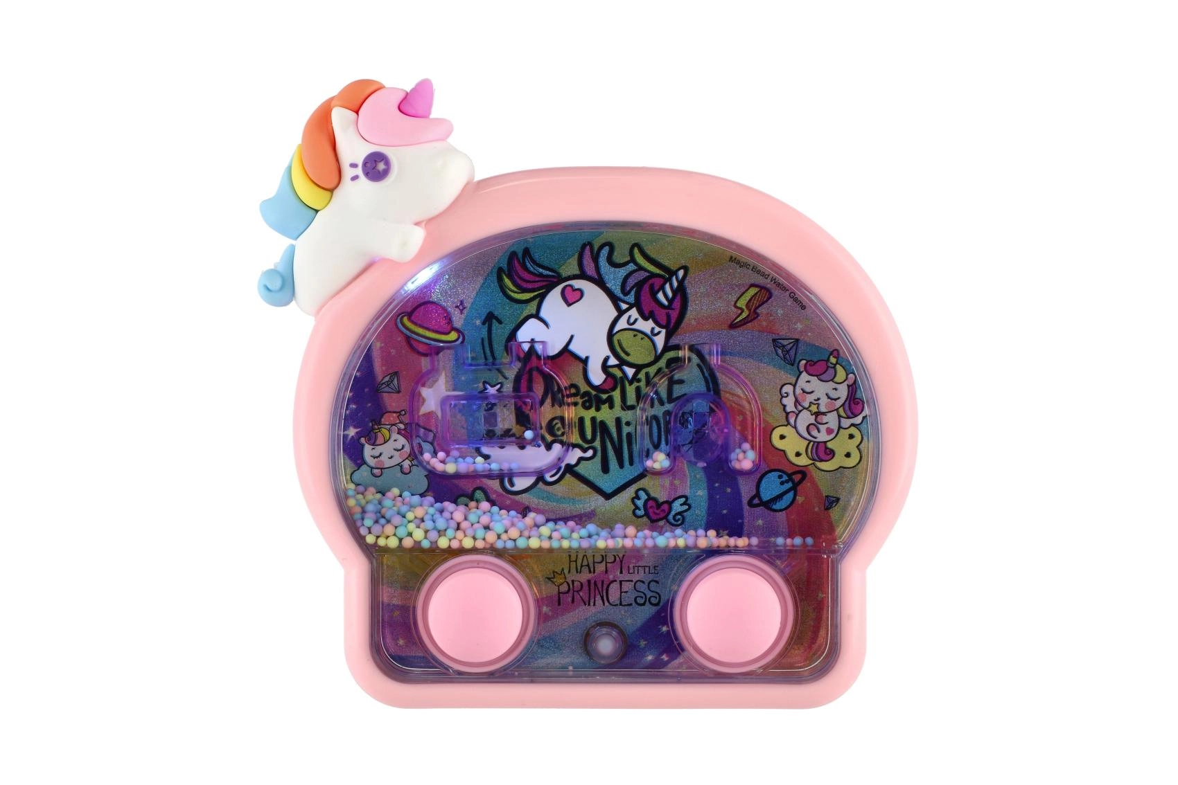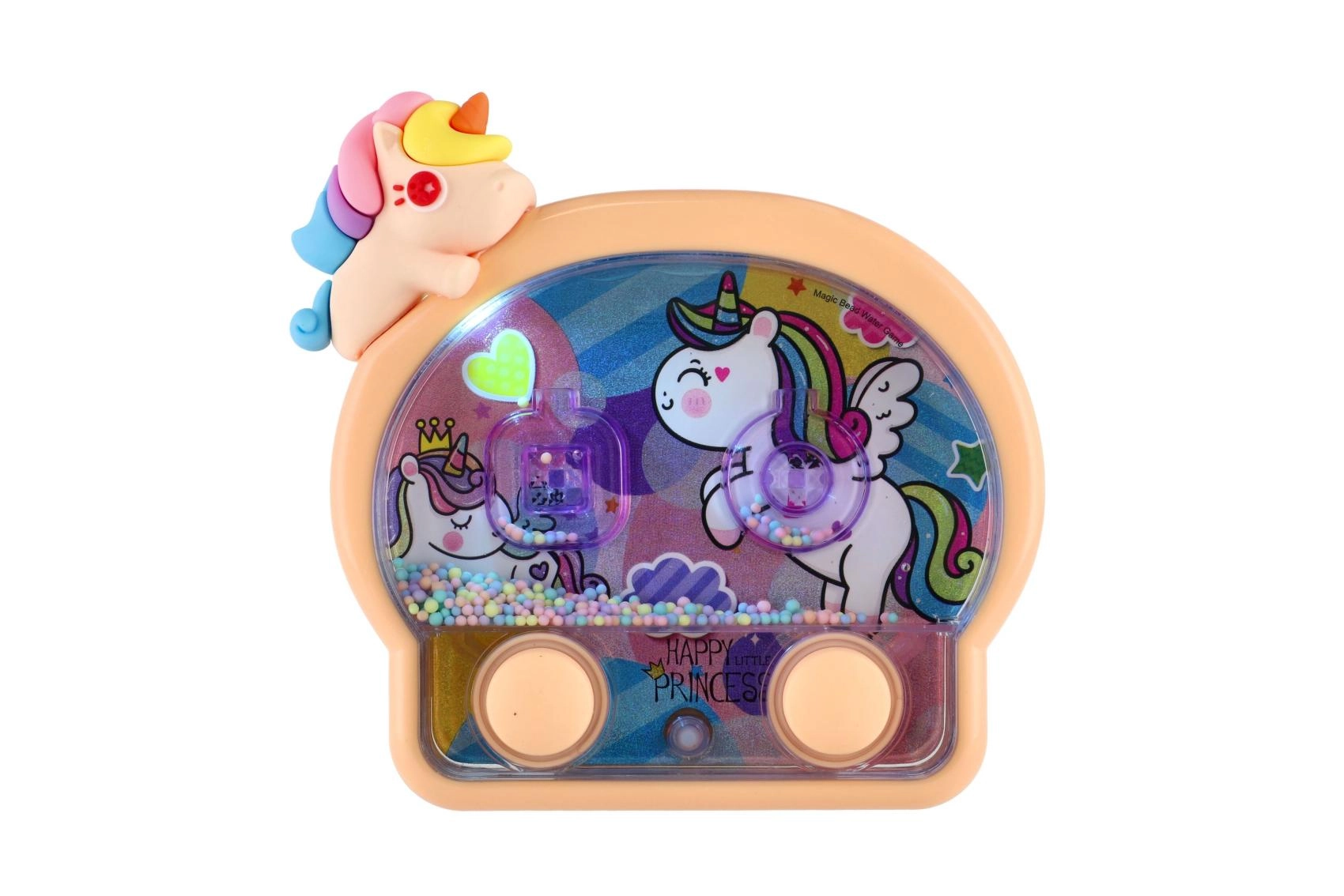 Questo adorabile gioco ad anelli ad acqua con design unicorno è il compagno ideale per i viaggi e per la cameretta. Il semplice controllo con due pulsanti mette in movimento l’acqua e aiuta i bambini a mirare con precisione gli anelli ai bersagli. Le luci al neon sottolineano l’aspetto fiabesco e rendono ogni partita una piccola festa.
