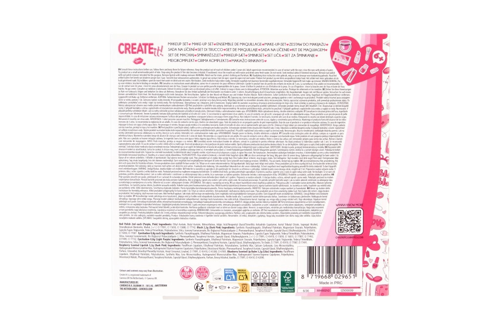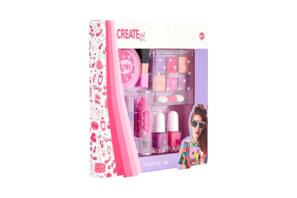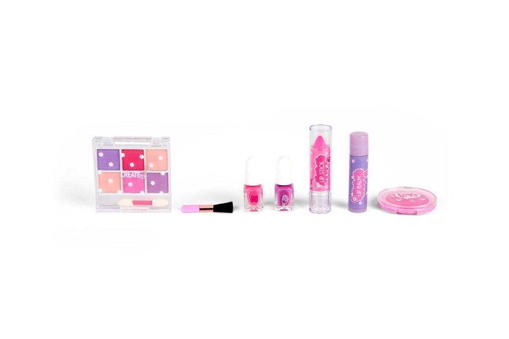 Scoprite un divertimento giocoso e sicuro con l’elegante set trucco per bambini CREATE IT! Pink Turquoise. Questo colorato set cosmetico per piccole vanitose dai 6 anni contiene tutto il necessario per un trucco creativo e lo styling delle unghie: 6 ombretti glitterati, 2 smalti per unghie, gessetto per capelli, balsamo labbra, rossetto, pennello grande e piccolo applicatore doppio.