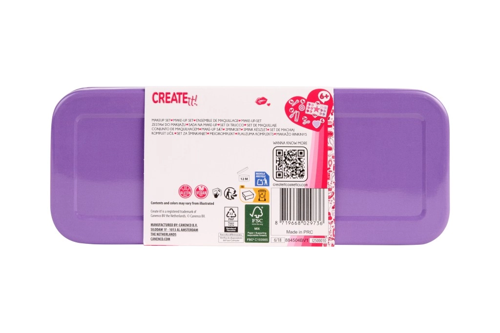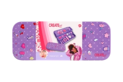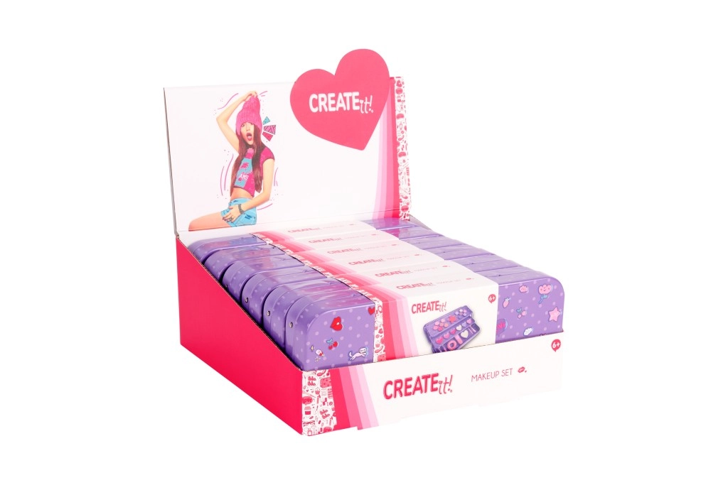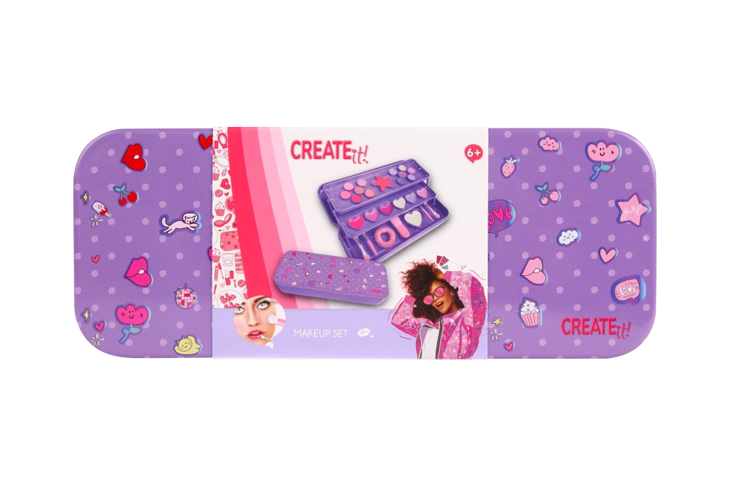 Stiloso cofanetto trucco viola CREATE IT! in una pratica scatolina di metallo, offre tutto ciò di cui le piccole amanti del make-up hanno bisogno. La struttura a tre livelli nasconde 10 ombretti, un blush, 6 lucidalabbra, pennellini, un elastico per capelli e uno specchietto a cuore. Grazie al design pieghevole, il contenuto è ordinato e facilmente accessibile – ideale per i viaggi e per il trucco a casa.