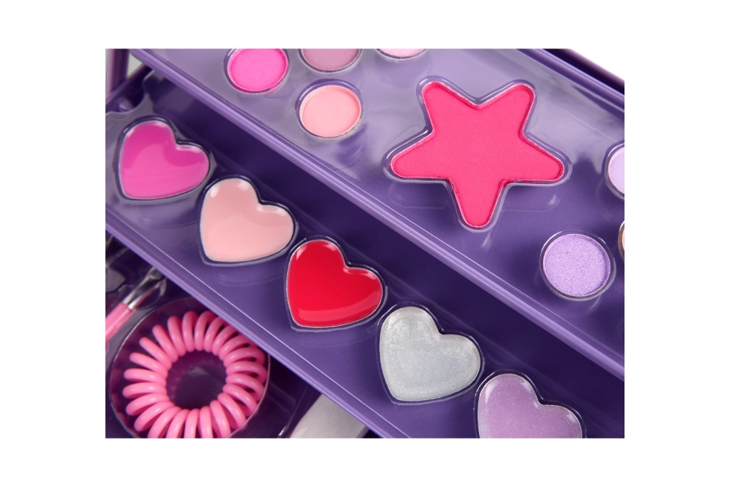 Il set include 10 ombretti, un blush, 6 lucidalabbra, 2 applicatori per ombretti, 2 applicatori per lucidalabbra, un pennello per blush, un elastico per capelli e uno specchietto a forma di cuore.
