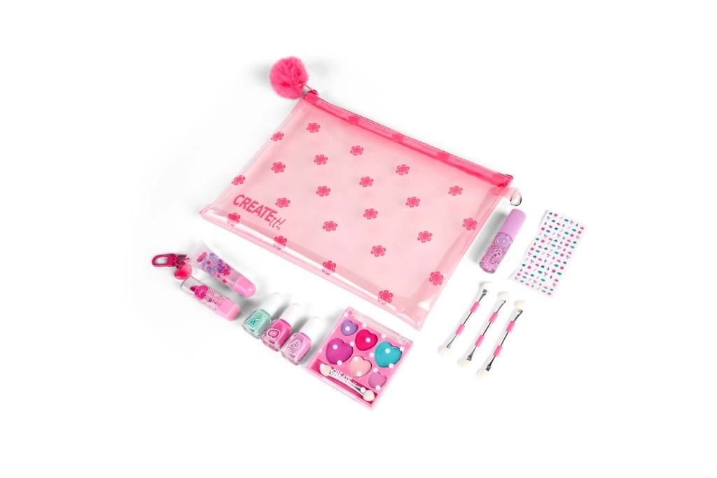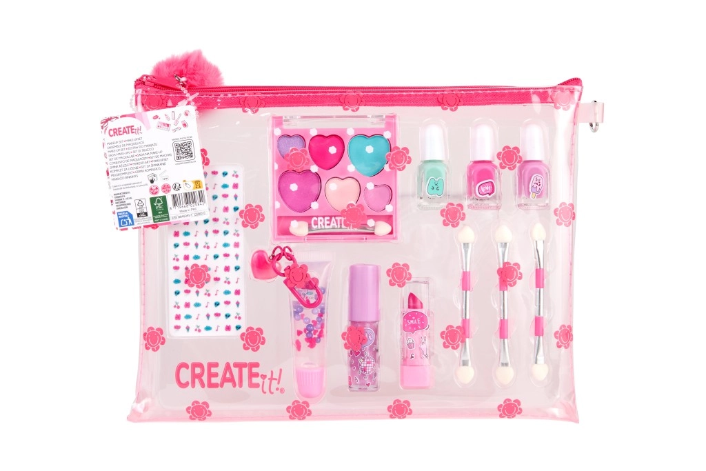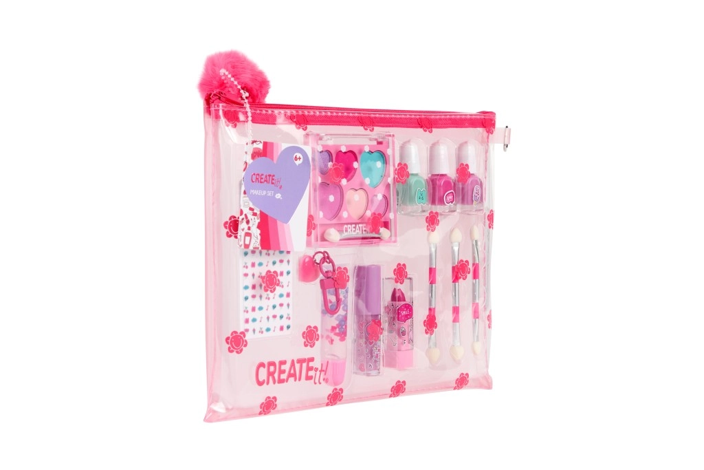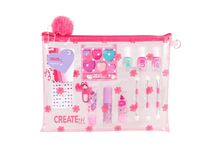 Questo allegro set trucco per bambini, in una pochette rosa trasparente con stampa floreale, offre un modo sicuro e divertente per scoprire il mondo del make‑up. Grazie all’organizzazione chiara, ogni elemento ha il suo posto e i bambini possono portare facilmente i cosmetici ovunque.