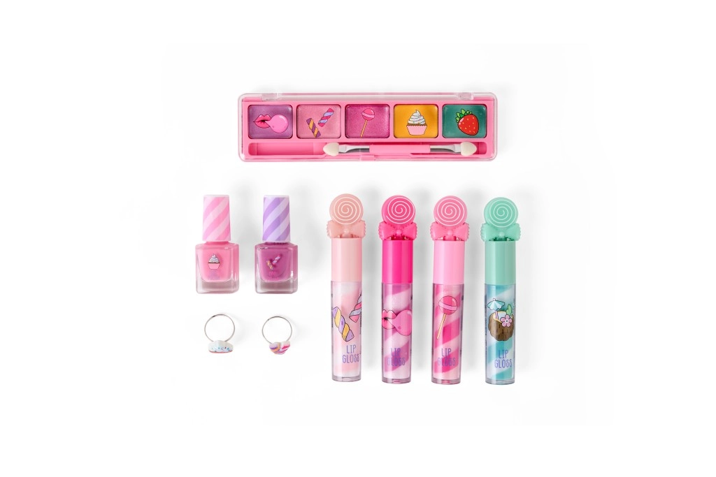 Dotazione completa per un gioco creativo: ombretti, gloss per labbra, smalti e anellini – i bambini hanno subito tutto a portata di mano.