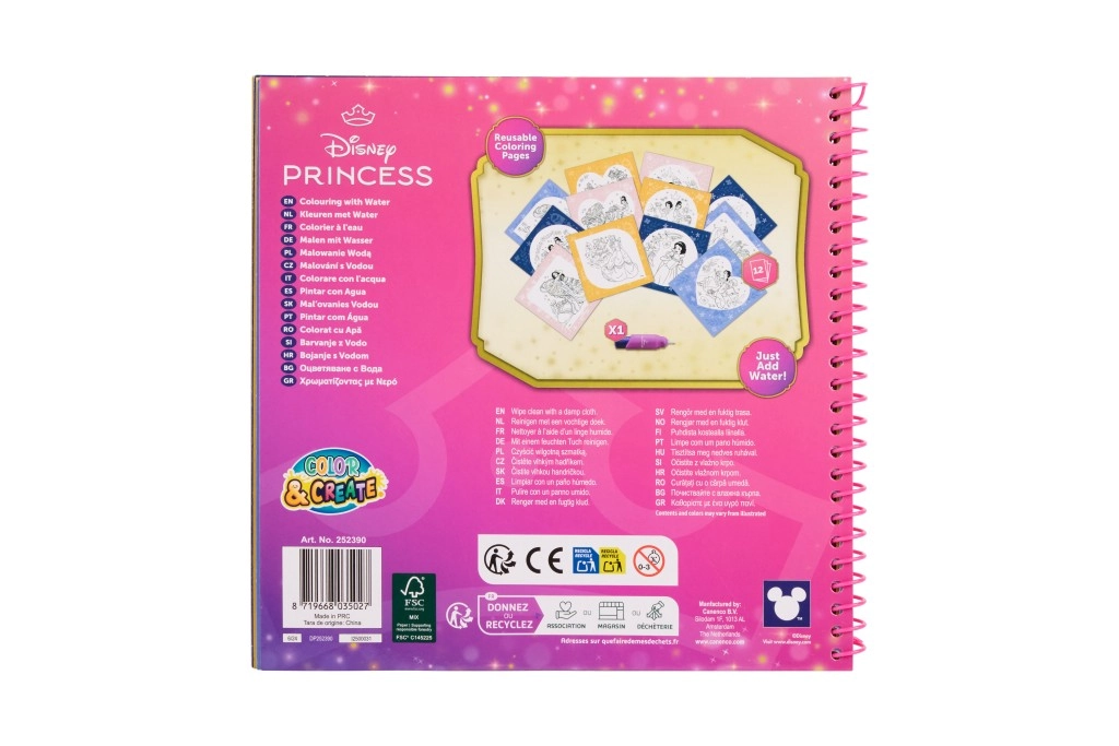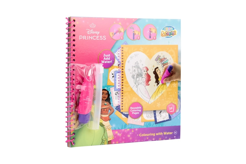 Questo libro creativo offre ai bambini un’attività sicura e pulita senza disordine. Grazie al pennello ad acqua, passando sull’illustrazione si rivelano splendide immagini delle amate Principesse DISNEY. Quando la pagina si asciuga, i colori svaniscono e i bambini possono dipingere ancora e ancora.