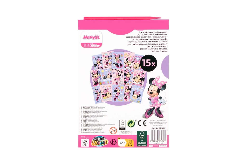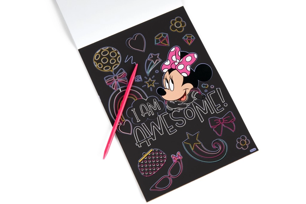 Sotto lo strato nero si nascondono colori vivaci e motivi di MINNIE, che i bambini rivelano con lo stilo: un’attività semplice, divertente e coinvolgente.