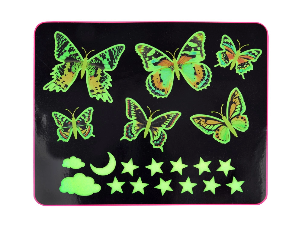 Crea un’atmosfera magica nella cameretta con un set decorativo di adesivi: farfalle colorate che di giorno abbelliscono le pareti e di notte emanano una delicata luce. Il set include anche stelline fosforescenti verdi, luna e nuvolette. L’installazione è facile e sicura; puoi combinare gli adesivi a piacere per creare composizioni personalizzate. Ideale come luce notturna rassicurante per i bambini che hanno paura del buio. Applicazione facile, luce notturna soffusa, decorazione creativa.