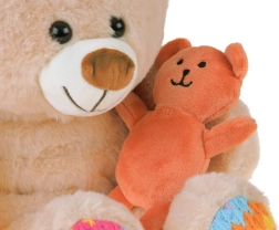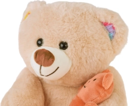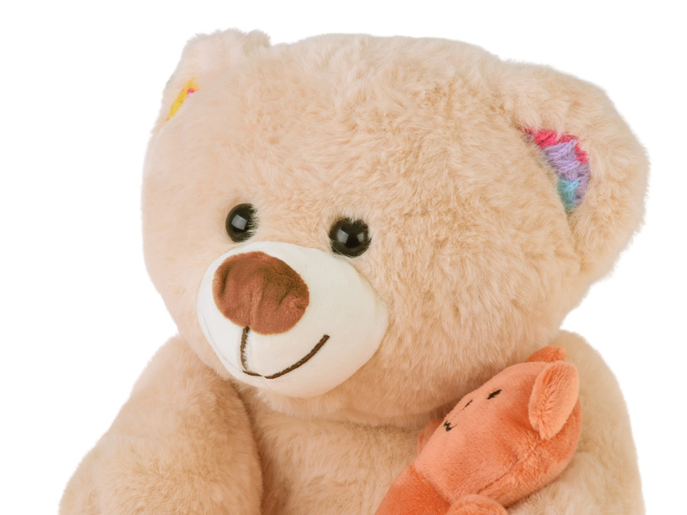 - Orsetto beige con dettagli colorati su zampette e orecchie, incluso un piccolo orsetto arancione