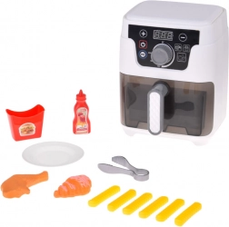 Incluso un ricco set di accessori: vassoio con patatine, ketchup, coscia di pollo, croissant, pinze, piatto e griglia per il cestello. I bambini possono “cucinare” in sicurezza, servire e allenare i ruoli sociali in casa.