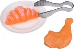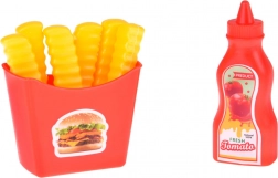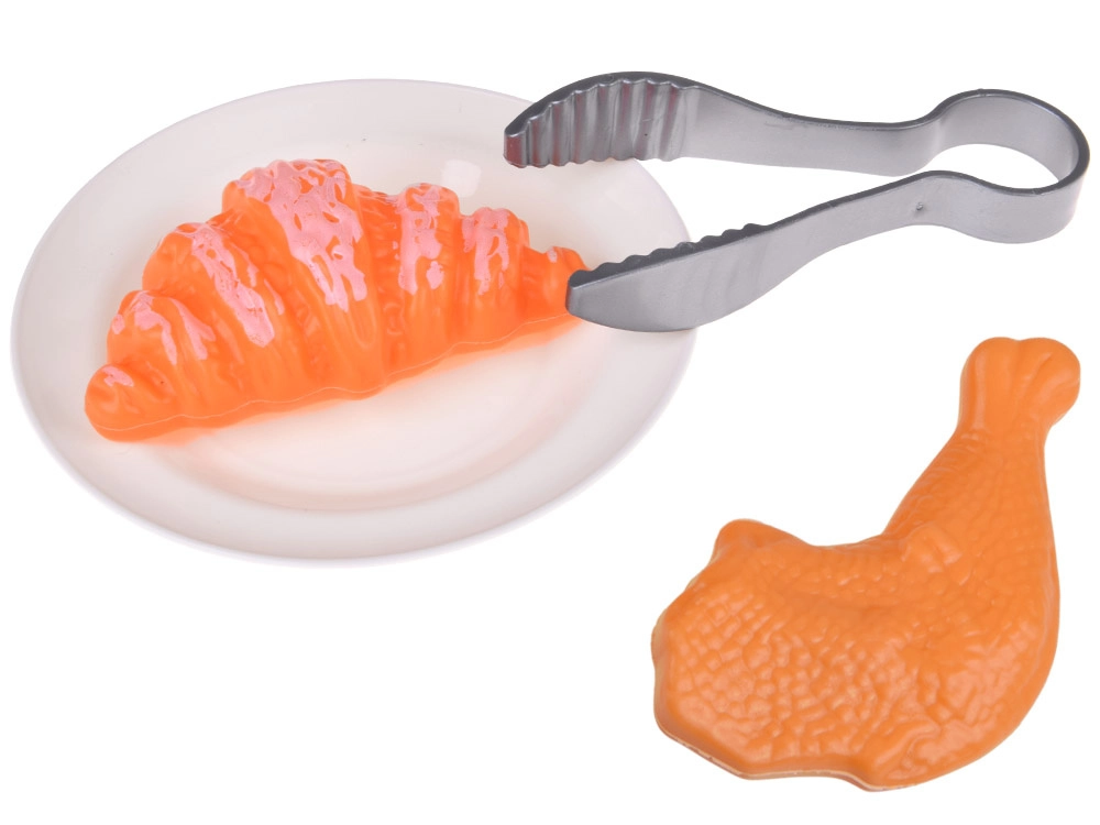 Piatto, pinze, griglia per il cestello, croissant, coscia di pollo, porzione di patatine con bicchierino e bottiglia di ketchup per stimolare il gioco creativo da piccoli chef.