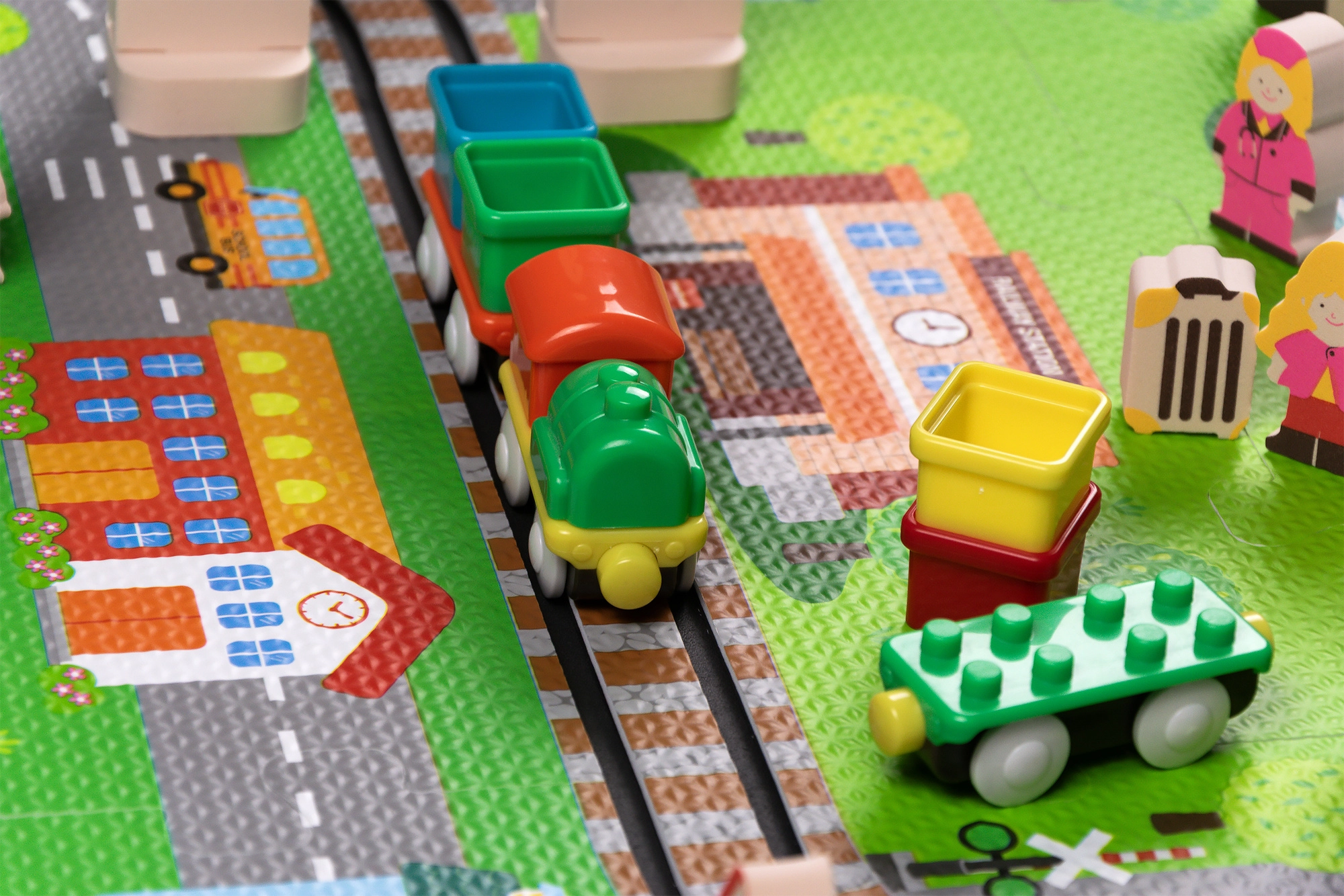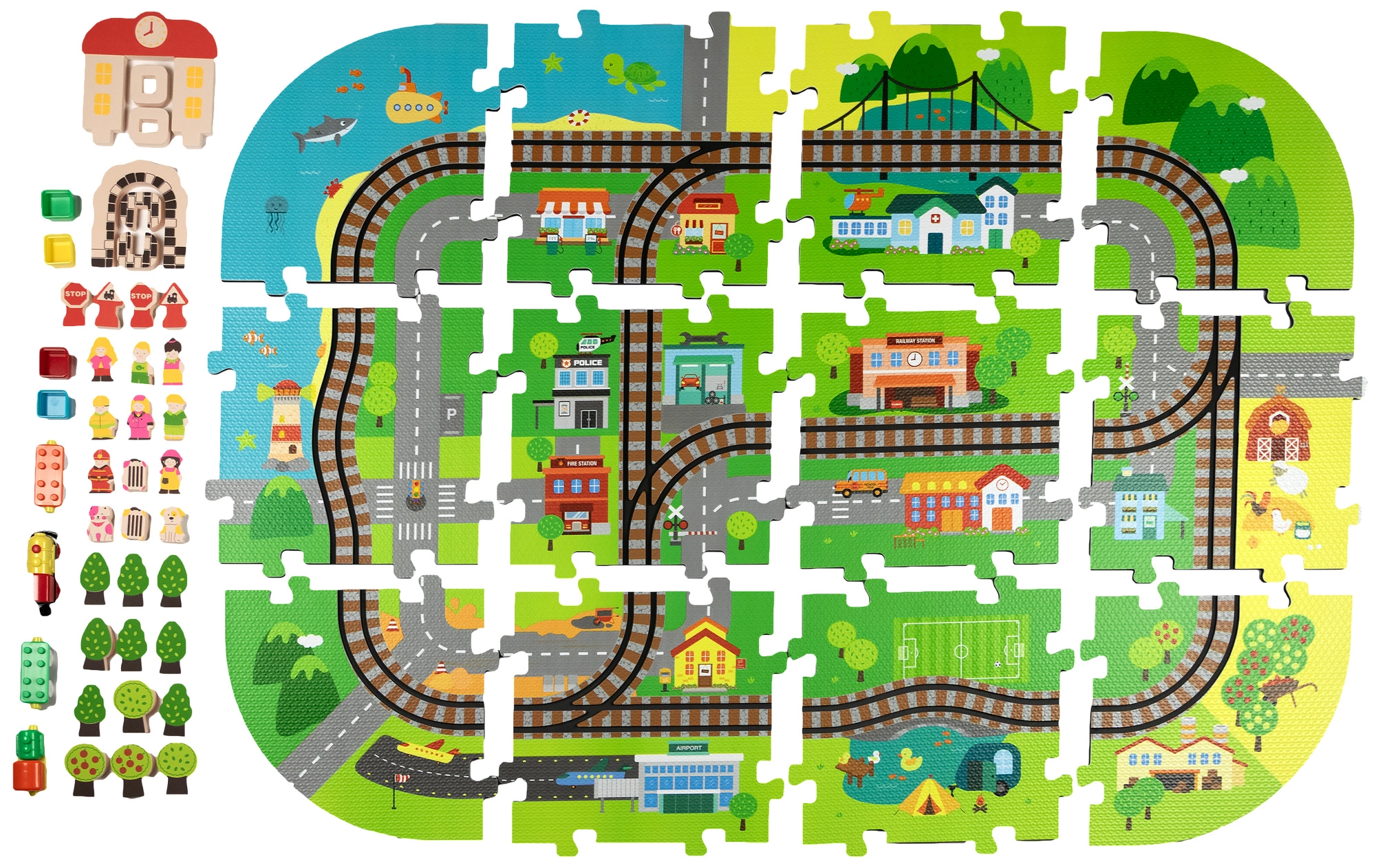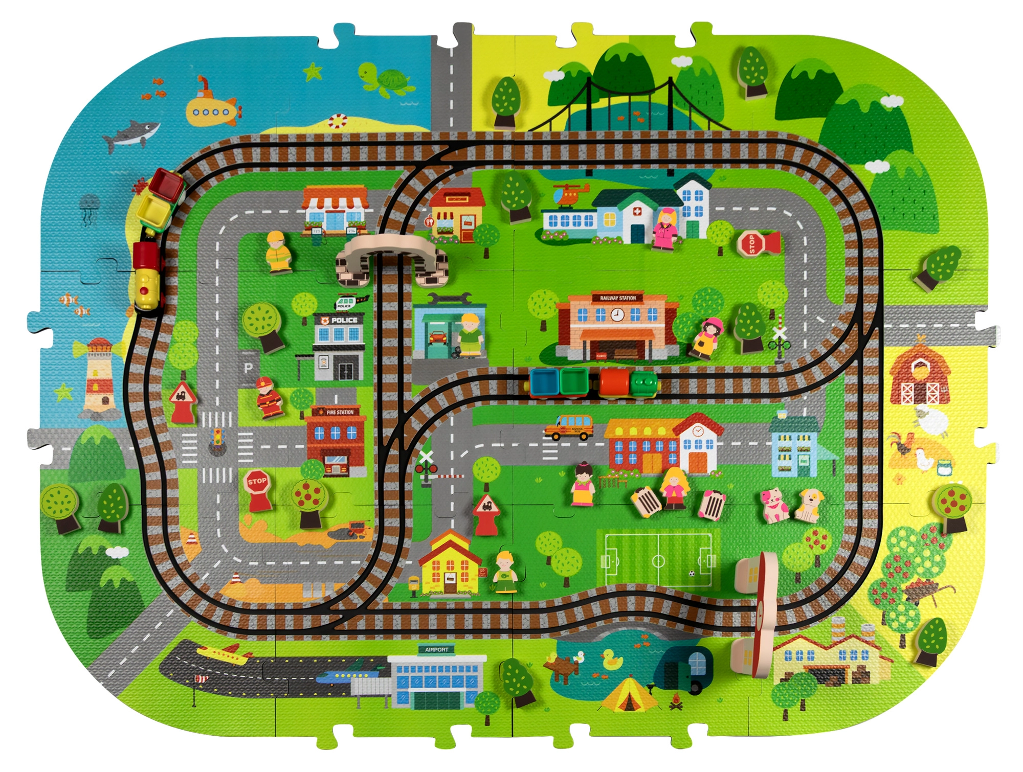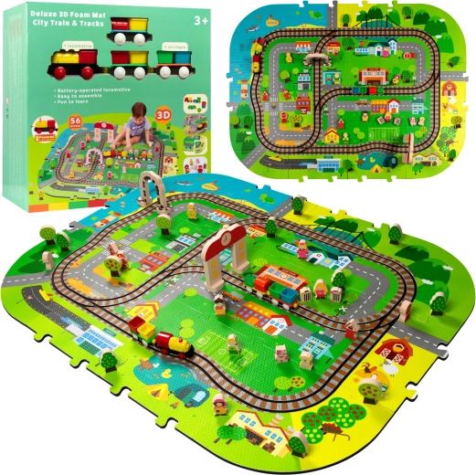 Questo set creativo combina un tappetino da pavimento morbido con una città 3D e un impianto ferroviario. I bambini costruiscono una scena colorata con viuzze, edifici, aeroporto, fattoria, mare, campeggio e montagne e lasciano che la locomotiva a batteria corra fluidamente sul tracciato assemblato. I robusti pezzi in schiuma EVA assorbono gli urti, isolano dal freddo e creano uno spazio di gioco sicuro.