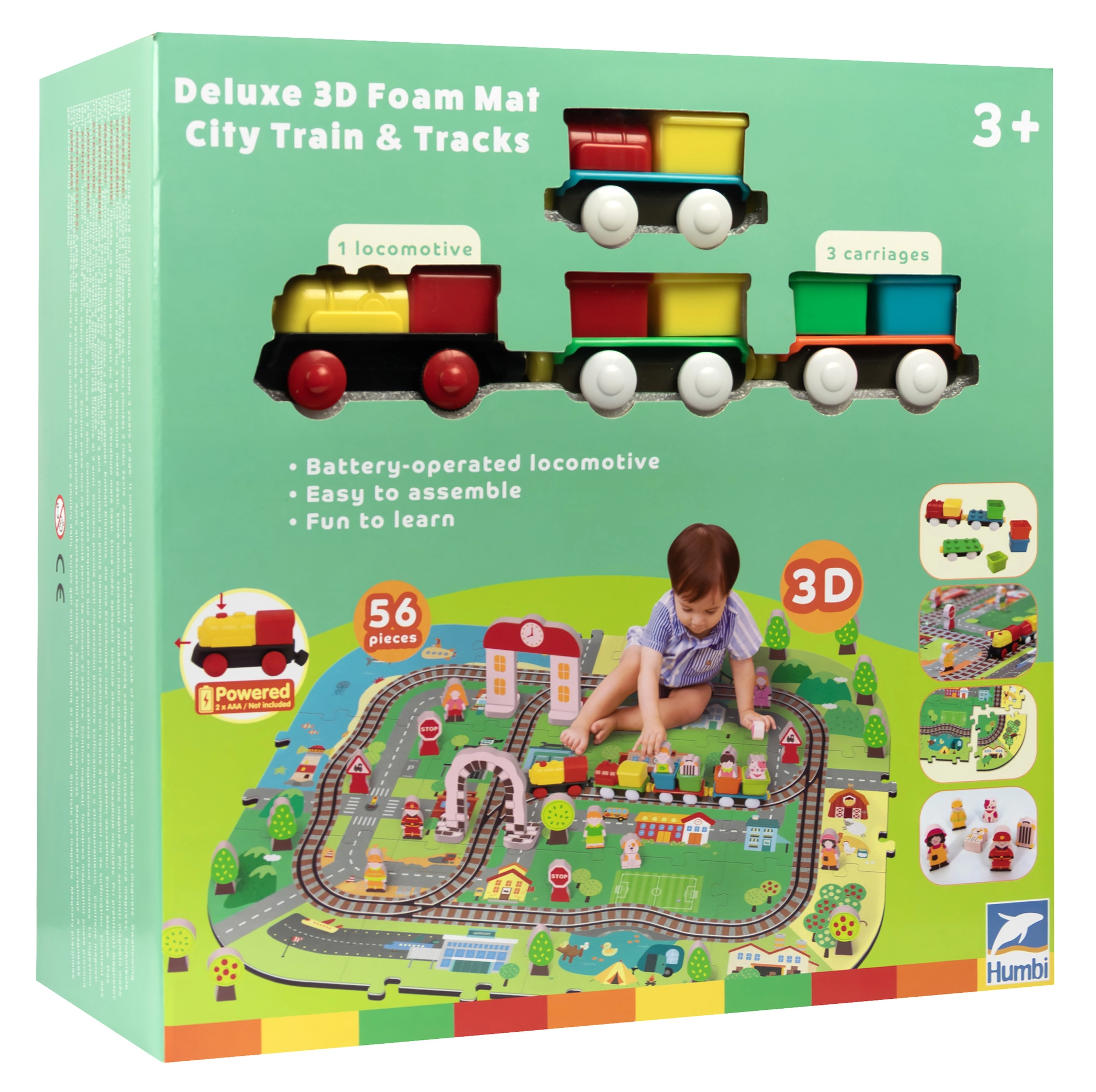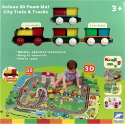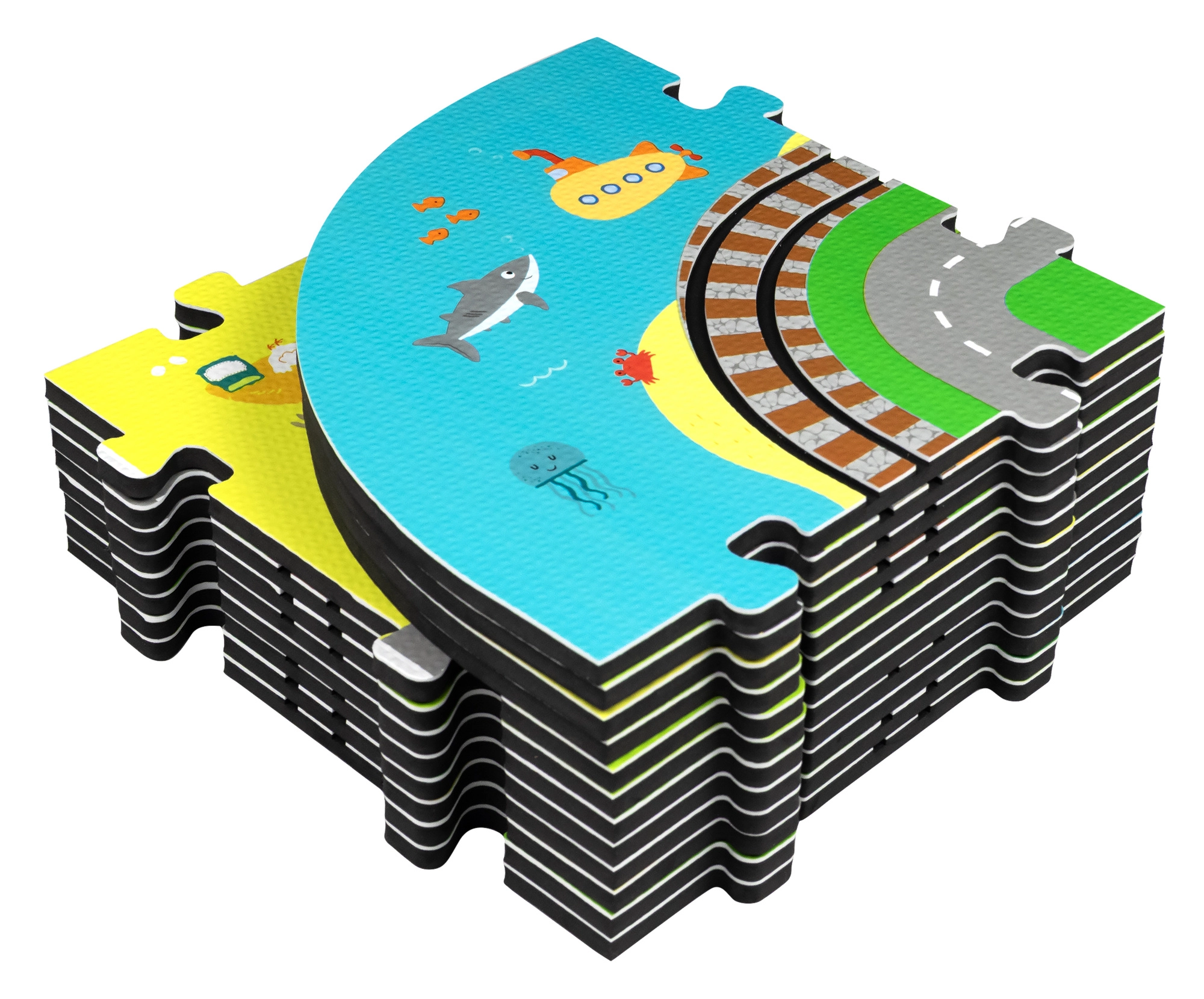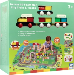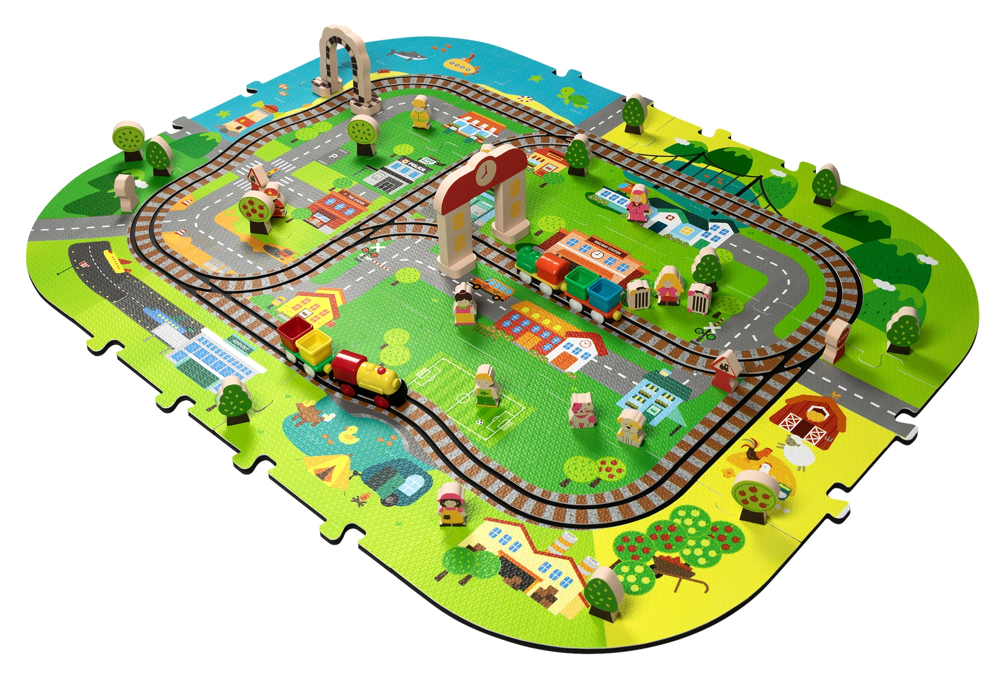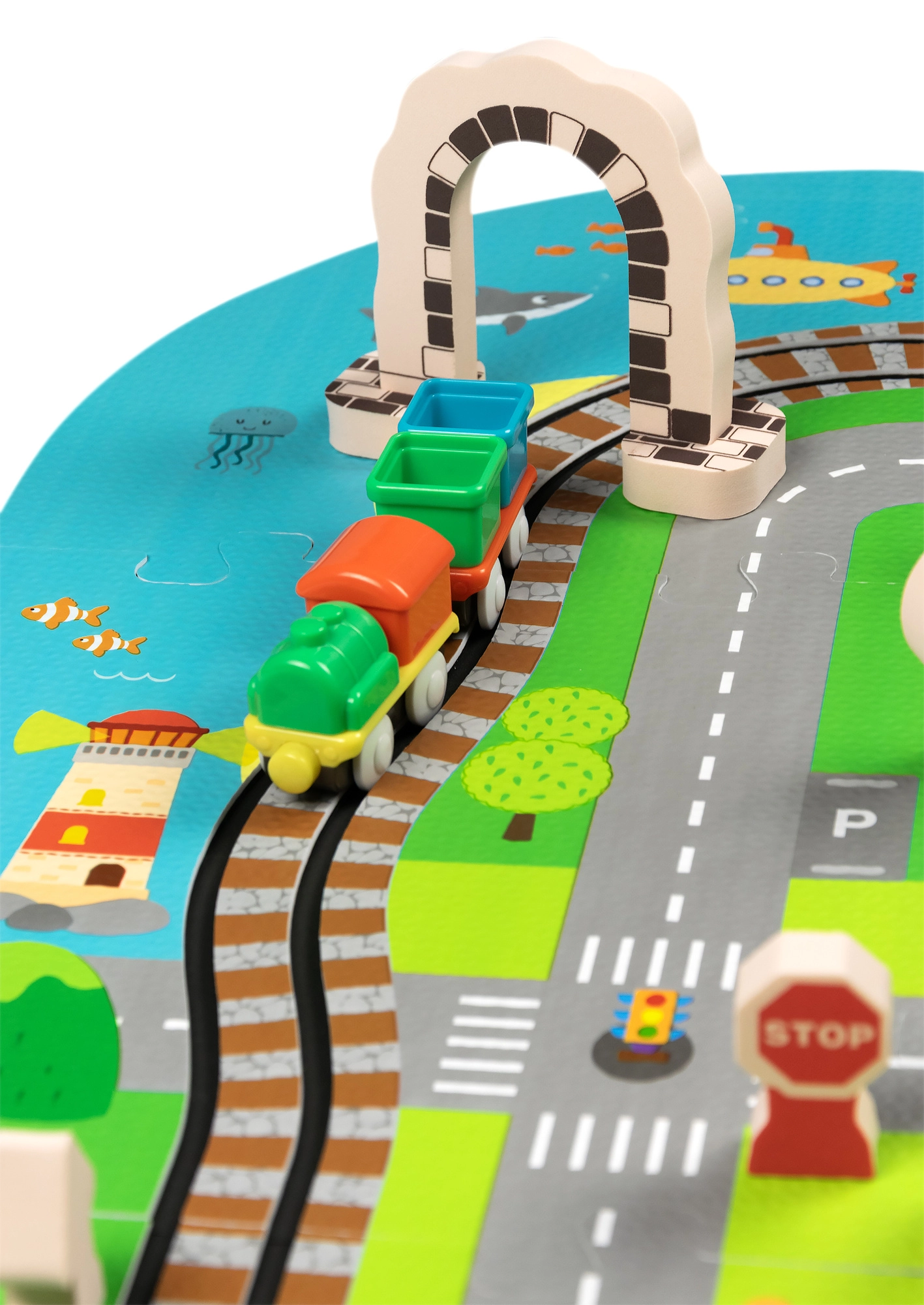 Questo set creativo combina un tappetino da pavimento morbido con una città 3D e un impianto ferroviario. I bambini costruiscono una scena colorata con viuzze, edifici, aeroporto, fattoria, mare, campeggio e montagne e lasciano che la locomotiva a batteria corra fluidamente sul tracciato assemblato. I robusti pezzi in schiuma EVA assorbono gli urti, isolano dal freddo e creano uno spazio di gioco sicuro.