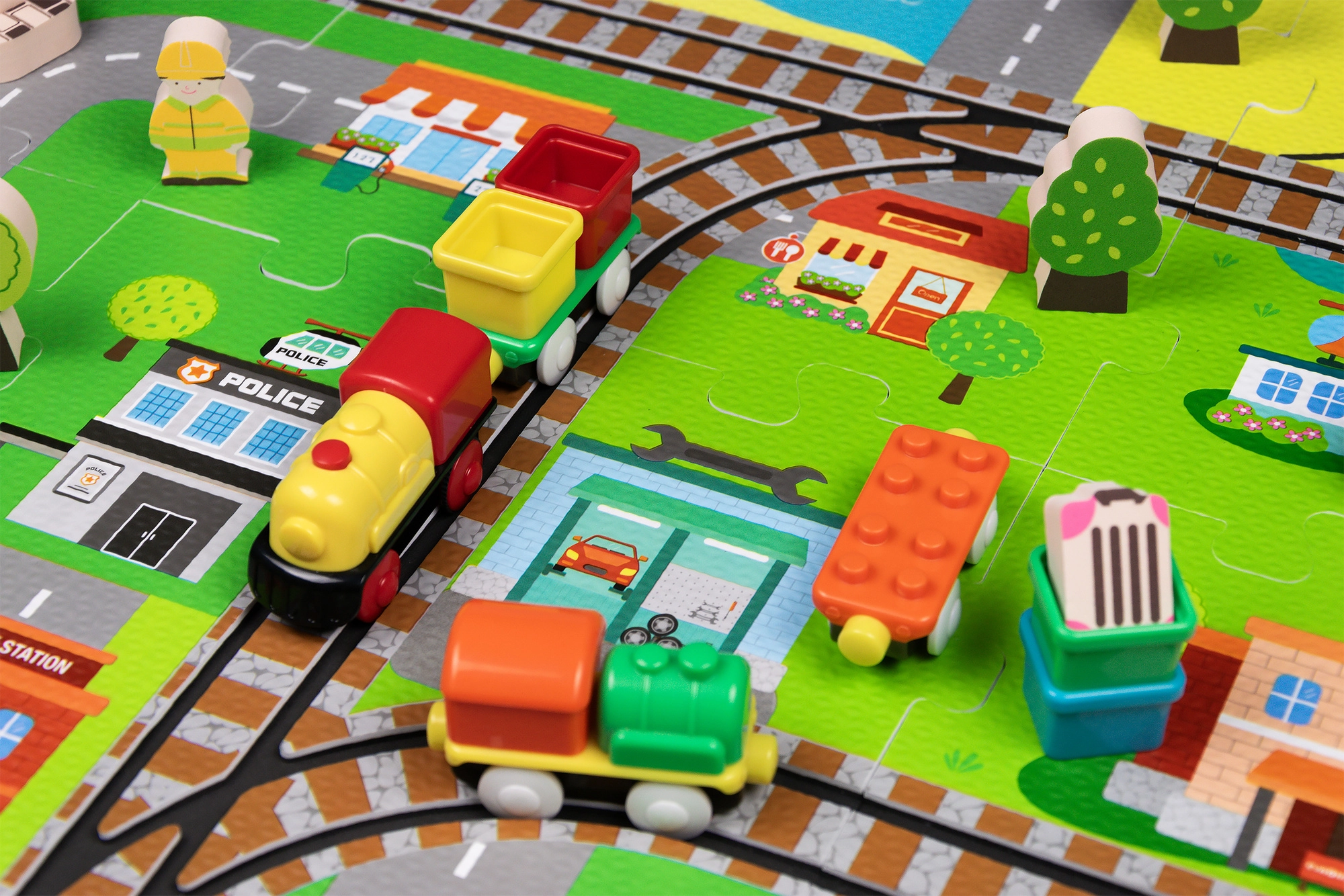 Collega i pezzi come un puzzle e crea la tua città con strade, binari, edifici e natura. I pezzi in EVA spessi mantengono la forma e sono facili da pulire.