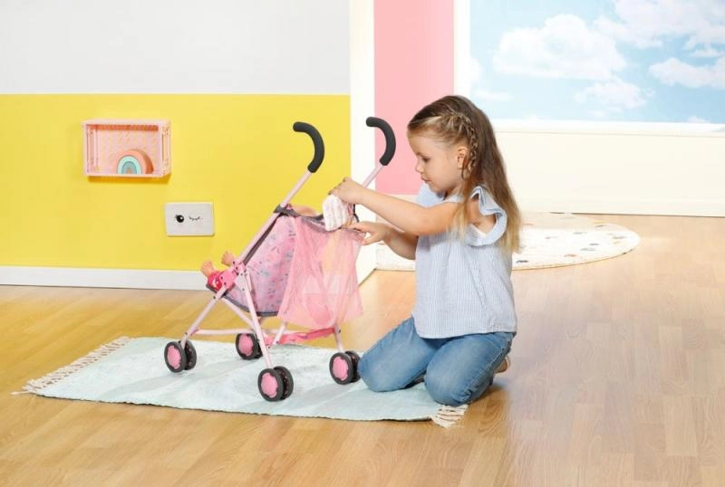 Il passeggino per bambole BABY born è ideale per le passeggiate quotidiane e per il gioco in casa. La leggera struttura in metallo, i comodi manici in schiuma e le quattro doppie ruote assicurano una guida facile anche per le piccole mani dei bambini. Il sedile con allegra fantasia è dotato di cinture di sicurezza che tengono la bambola saldamente in posizione.