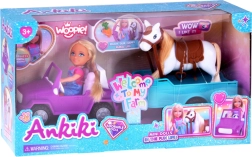 Parti per avventure di campagna con il set di gioco Woopie, dove la bambola Niki guida una jeep viola e trasporta il cavallo con un rimorchio turchese. La bambola ha lunghi capelli biondi da pettinare, il cavallo è dotato di sella e briglie. Giocattolo ideale per sviluppare fantasia e creatività dei bambini dai 3 anni.