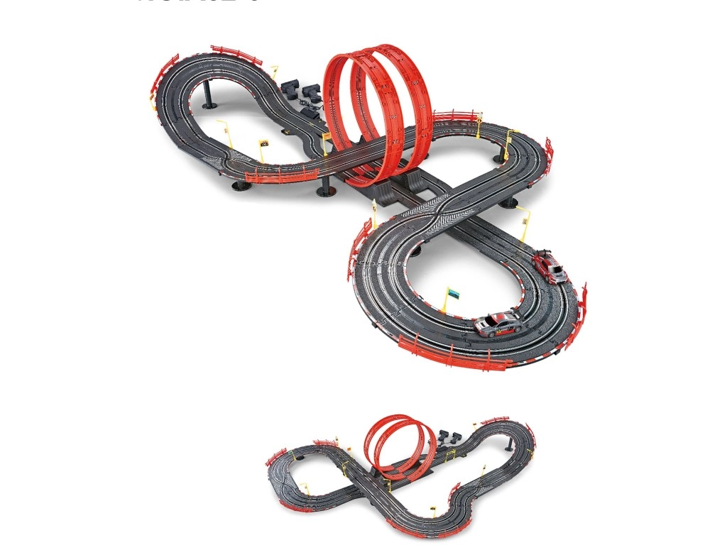 L’ampio layout con ponti e curve offre corse fluide e sfide tecniche. Ideale per confrontare velocità e controllo di due veicoli.