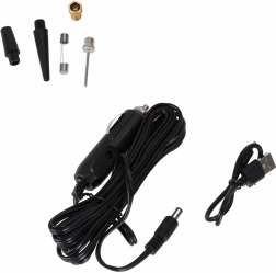 - pompa elettrica/mini compressore, tubo, 5× beccuccio intercambiabile, cavo USB, cavo per accendisigari auto, manuale