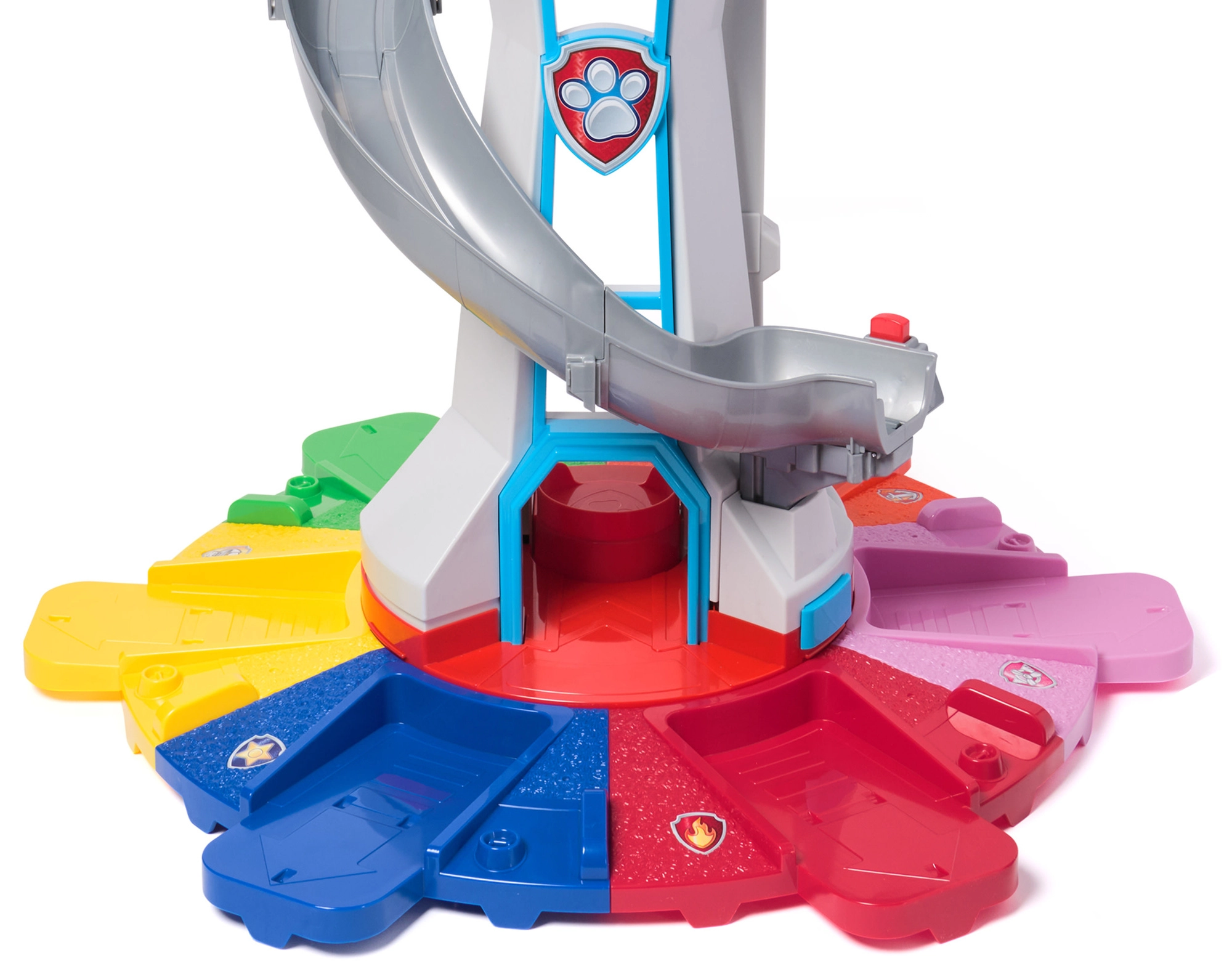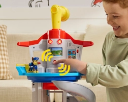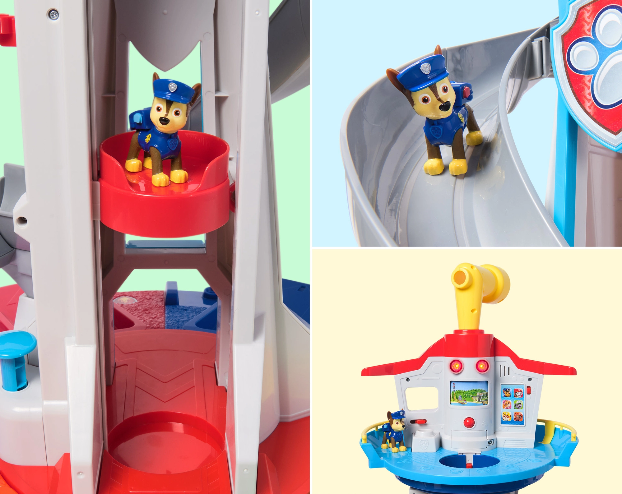 L’iconica base di PAW PATROL offre infinite possibilità di gioco. Dopo aver scelto la missione dal pannello con pulsanti ed effetti, basta portare Chase in alto con l’ascensore, osservare con il periscopio girevole e avviare l’eroico salvataggio lungo l’ampio scivolo direttamente sulla rampa di lancio rotante.