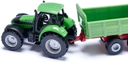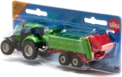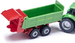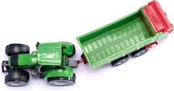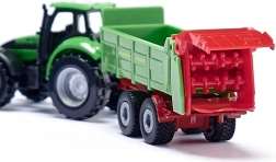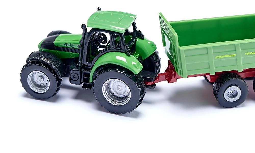 Il trattore DEUTZ con spandiconcime STRAUTMANN in scala compatta offre dettagli curati, un gancio di traino funzionale e ruote scorrevoli per una guida fluida.