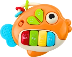 Il pianolino musicale a forma di pesciolino è il primo strumento ideale per i bambini piccoli. I quattro tasti ben evidenziati Do, Re, Mi, Fa, quando premuti, riproducono allegre melodie e singole note, sviluppando in modo naturale il senso del ritmo e la percezione del suono. L’ergonomica forma a pesciolino si adatta perfettamente alle manine; il corpo leggero e i bordi lisci e arrotondati garantiscono un uso sicuro e confortevole.