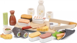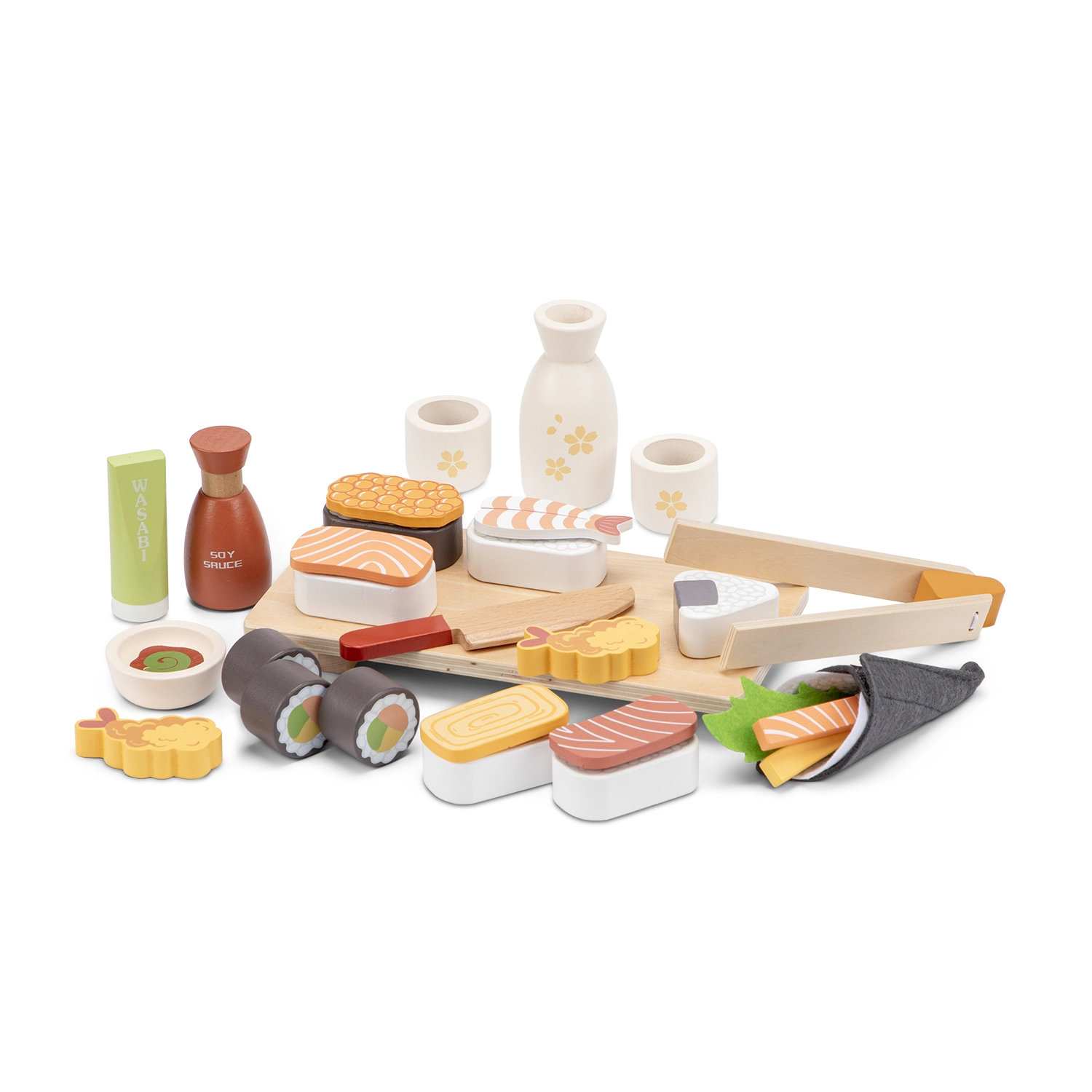 Nigiri, roll e sashimi dipinti nei dettagli, completati da wasabi, salsa di soia e tagliere da portata – tutto per un gioco di cucina autentico.