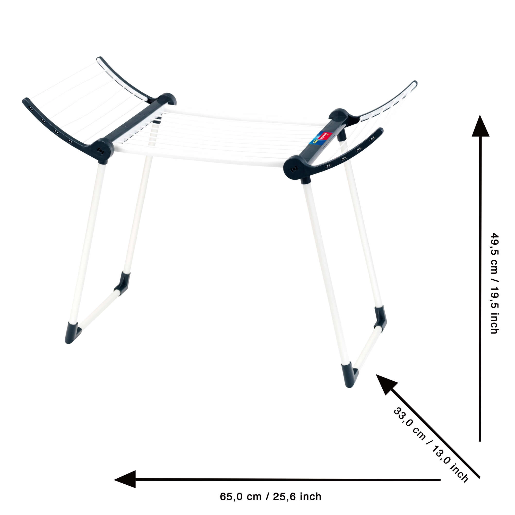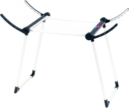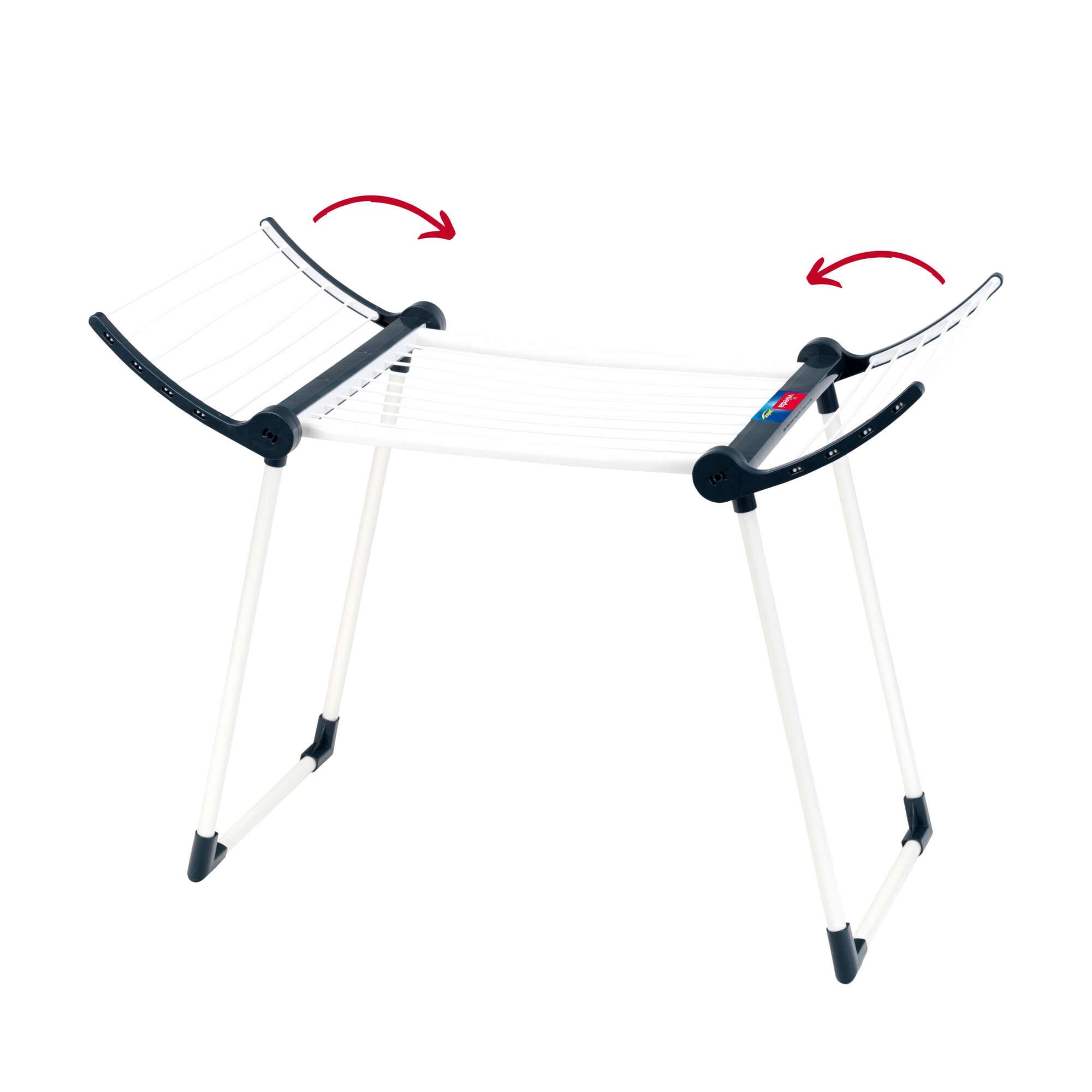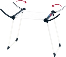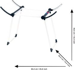 La struttura è robusta e stabile grazie alle gambe doppie, lo stendino è bianco con elementi neri e dispone di due ali ribaltabili per maggiore superficie di asciugatura. Dopo il gioco si ripiega facilmente in dimensioni compatte, risparmiando spazio nella cameretta.