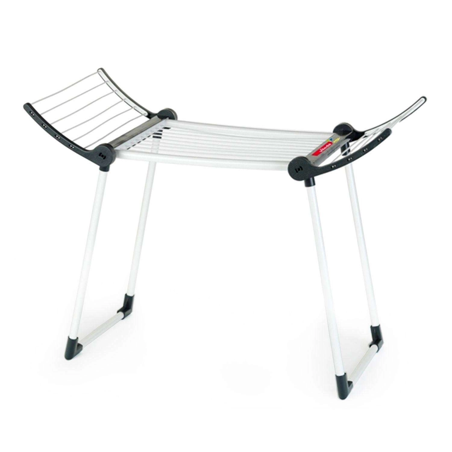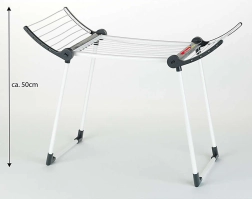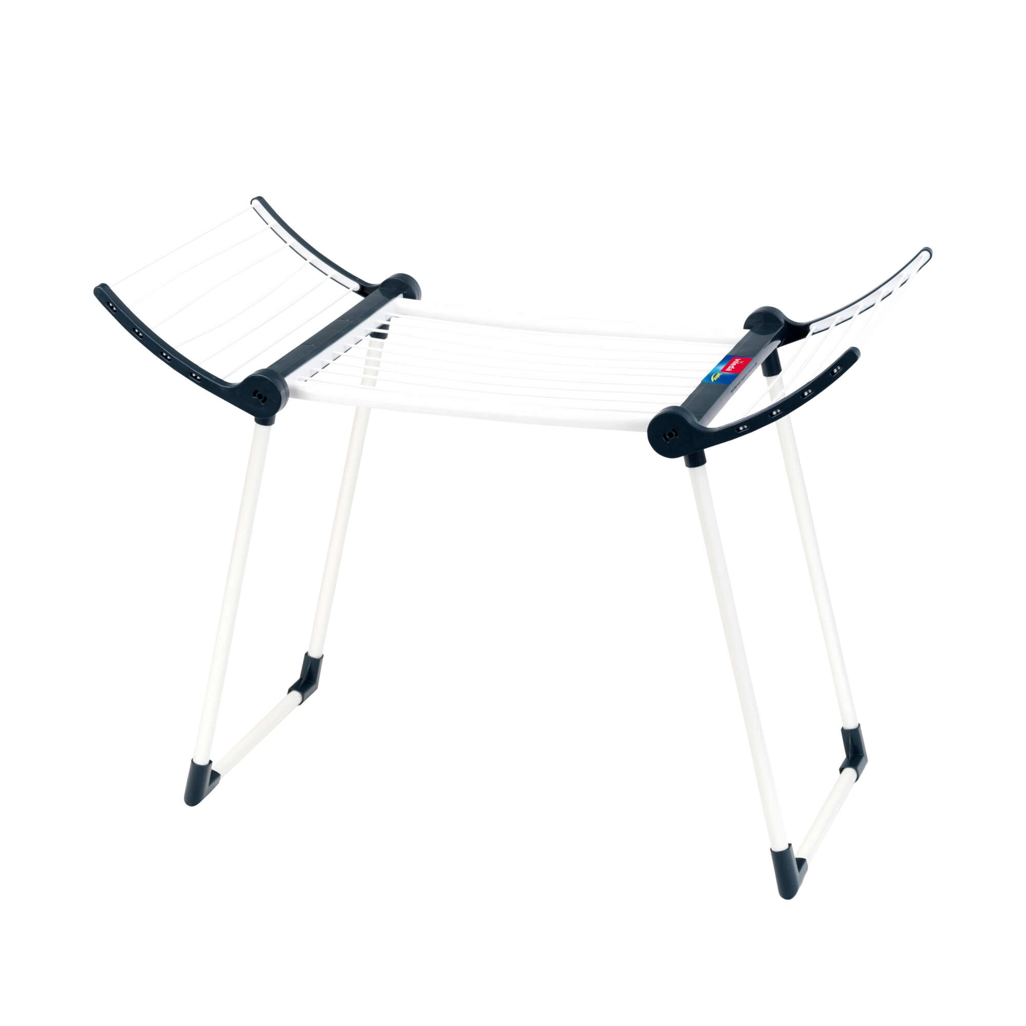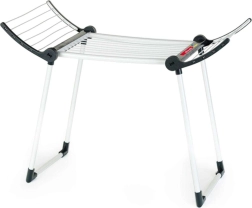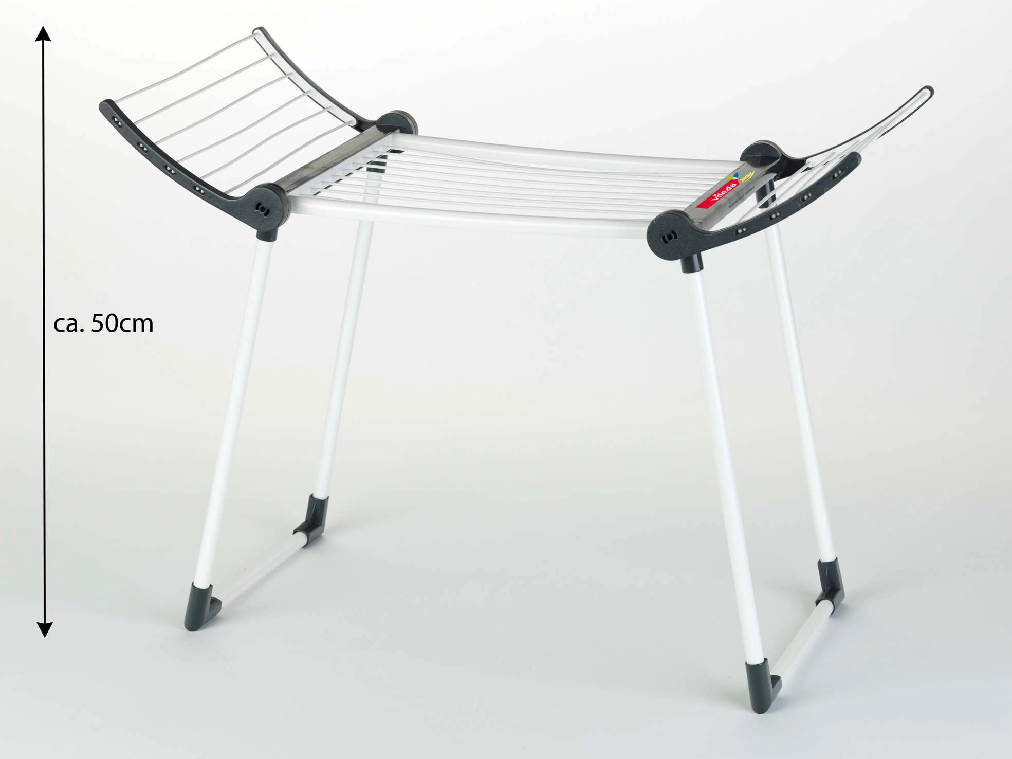 La struttura è robusta e stabile grazie alle gambe doppie, lo stendino è bianco con elementi neri e dispone di due ali ribaltabili per maggiore superficie di asciugatura. Dopo il gioco si ripiega facilmente in dimensioni compatte, risparmiando spazio nella cameretta.