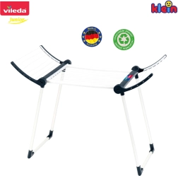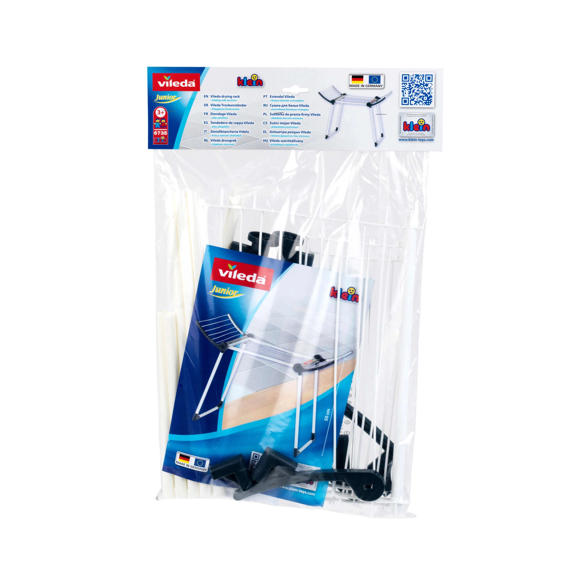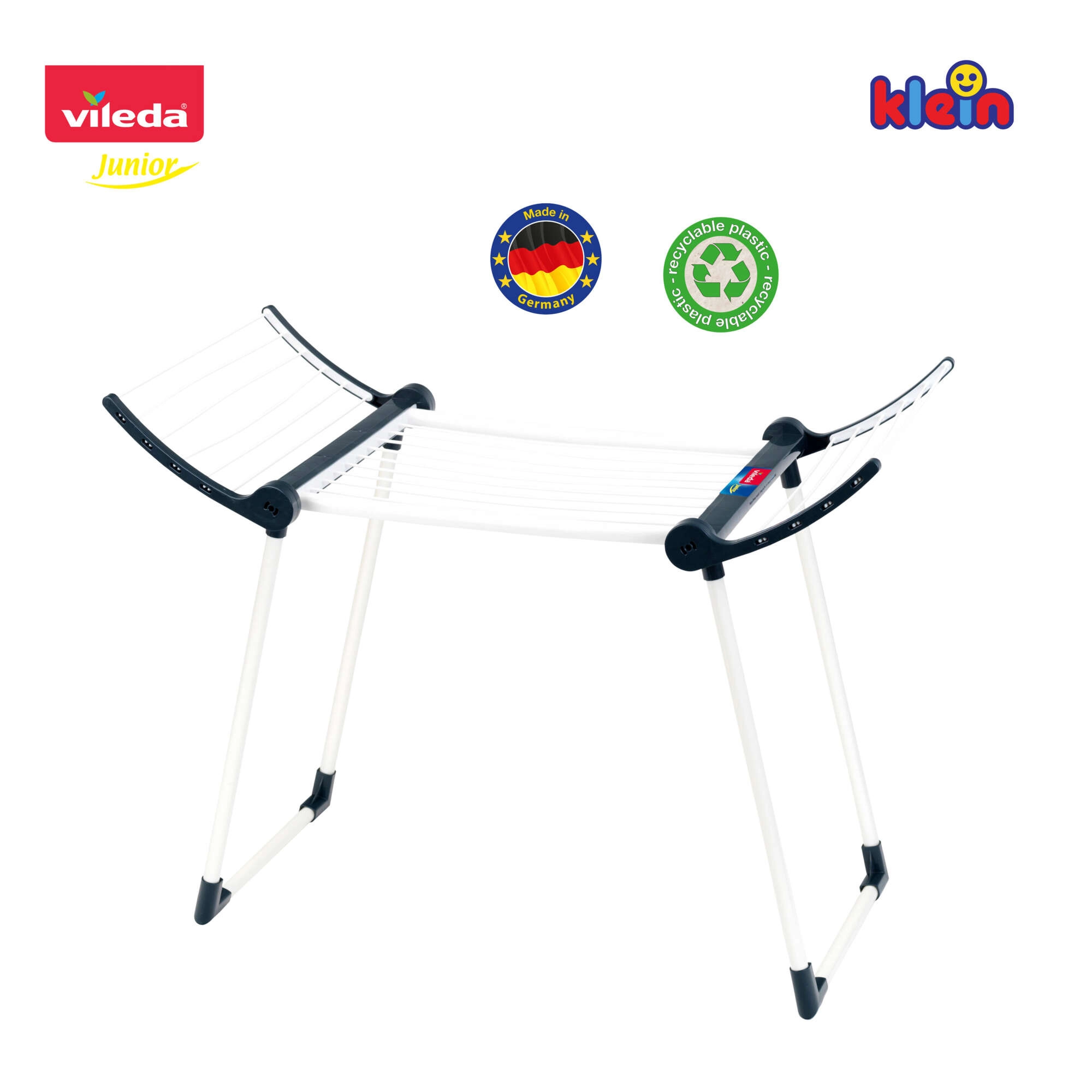 Il realistico stendibiancheria per bambini Vileda del marchio KLEIN è una fedele copia di quello vero e offre ai bambini un'imitazione sicura e divertente delle faccende domestiche. È realizzato con attenzione ai dettagli, ha gambe doppie stabili, due ali ribaltabili e peso ridotto. Grazie alla possibilità di ripiegarlo in dimensioni più piccole, non occupa spazio quando non viene utilizzato.