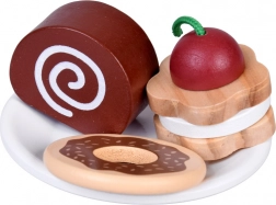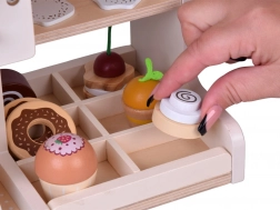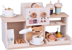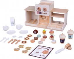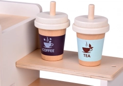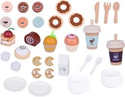 Il ricco set di accessori include tazze con piattini e cucchiaini, bicchieri con coperchi da asporto (Tea, Coffee), cartone del latte, posate, vari dolcetti, muffin, biscotti e cioccolatini, e un semplice menu. Tutto è perfettamente adatto alle manine dei piccoli e favorisce motricità fine, coordinazione occhio–mano e abilità sociali.